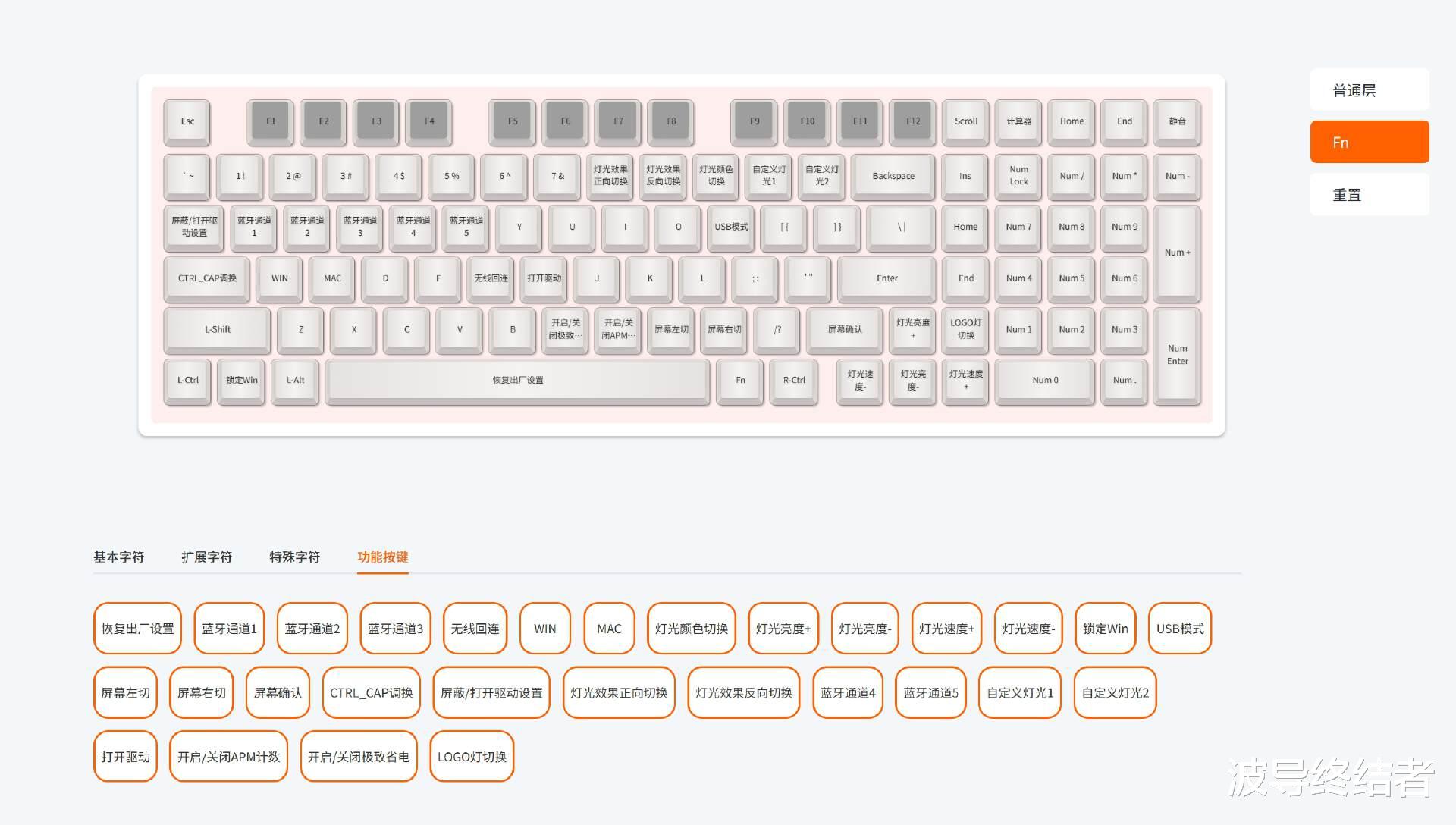 准备上机实战。GANSS给键盘做了网页版驱动,省去下载安装的功夫。键盘实际上的键位是够104的,除了Fn预设的一大堆功能键之外,普通层的几乎所有按键,以及Fn组合的大半区域,都能够自由定义按键功能。