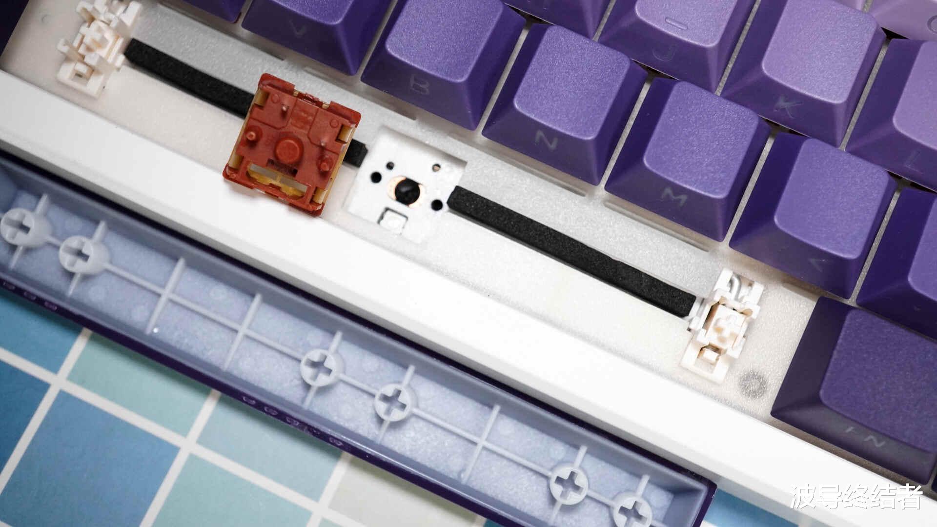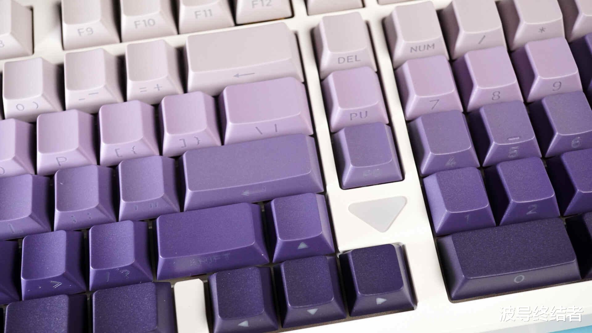 再来看看其它部分。这款键盘目前有十来种配色/键帽方案,以及6种轴体,我入手了新出的KTT闪电轴V2,触发力度48gf,导通行程1.30mm,按键有一种清脆的马蹄音,平时码字手感相当不错。我选的侧透紫款,PBT双色注塑键帽,耐用度更是没话说。