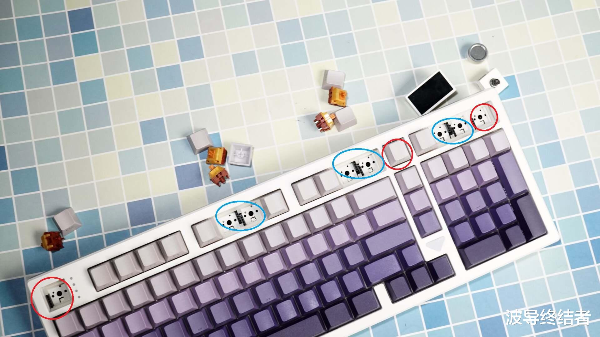 其中,ESC、INSERT以及右上角原来的旋钮,共有3个键位支持机械轴或者旋钮的任意自定义,如上图红圈。而F6+F7,F11+F12,以及原来右上角的显示屏位,也有3处可以自由更换成屏幕或者机械轴按键。无论是功能还是可玩性,以及自由度,都非常不错。