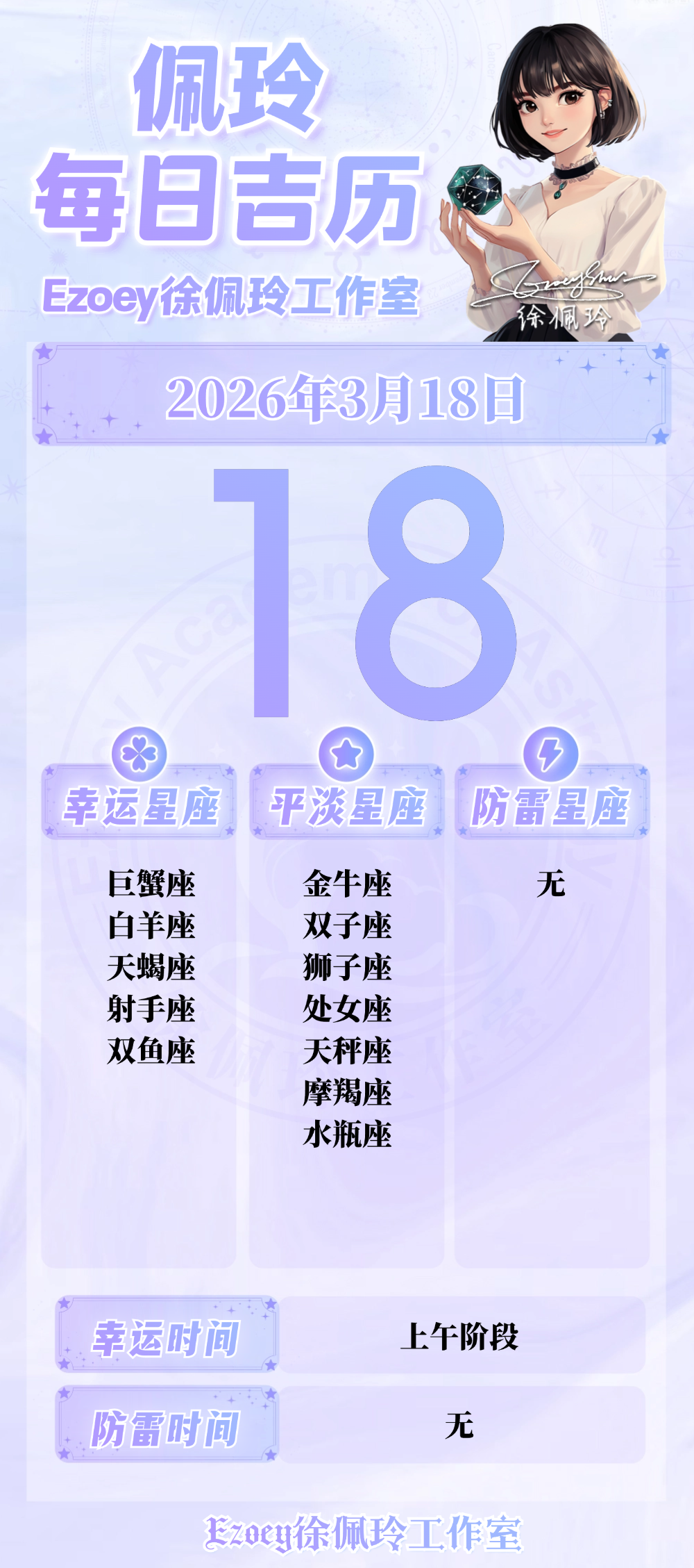 【3.18日播报】快速提升日 幸运星座:巨蟹座、白羊座、天蝎座、射手座、双鱼座——Ezoey徐佩玲26年星座播报