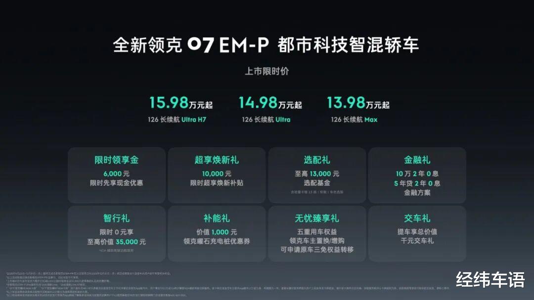 全新有为,极智新境。9月25日,都市科技智混轿车——全新领克07 EM-P正式上市。新车共推出126长续航Max、126长续航Ultra、126长续航Ultra H7三款配置版本,上市限时价13.98万元起。同时,全新领克07 EM-P还准备了限时领享金、超享焕新礼、选配礼、金融礼、智行礼、补能礼、无忧臻享礼、交车礼在内的8重限时福利。