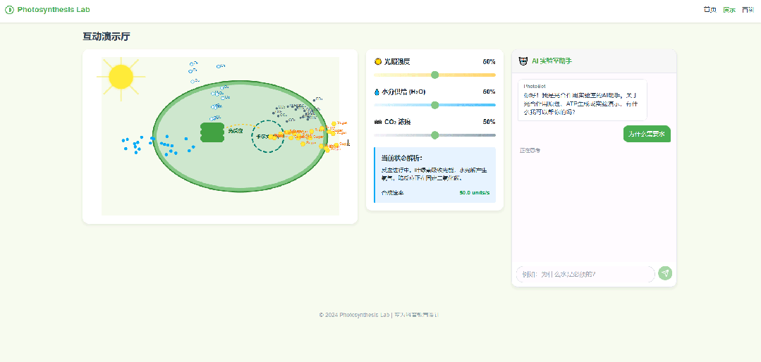 不但生动展示了光合作用所需要的元素(水、CO2、光能),产出的物质(O2、葡萄糖),还可以通过调整元素的供给直观感受其对光合作用的影响。甚至还提供了AI助手问答的版块。
