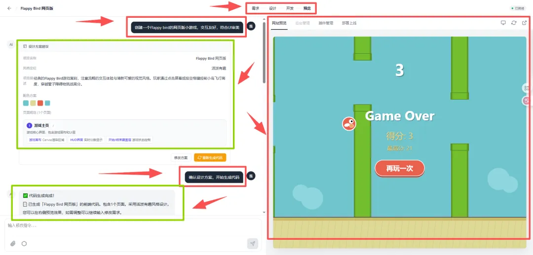 只需要把一个粗糙的想法告诉它:“创建一个Flappy bird的网页版小游戏,交互友好,符合UI审美。”