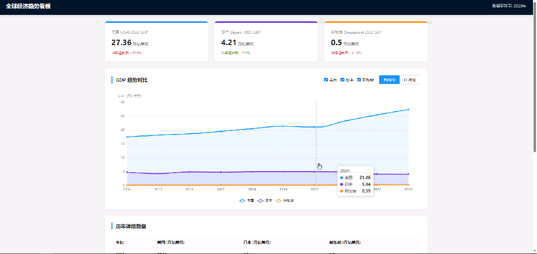 帮我创建一个网站演示美国、日本、新加坡3个国家最近10年的GDP变化用可视化动态图表的形式,交互友好,符合UI审美
