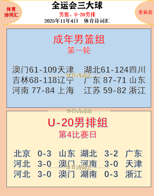 【成年男篮】成年男篮一共14队,三支东道主分别进入不同小组,其中I、III组有5队,II组只有4队,最终将在11月14号产生冠军。在率先结束的4场比赛里,澳门61-109天津、吉林68-118辽宁、河南77-84上海、湖北61-124四川。今晚剩余两场展开比拼。