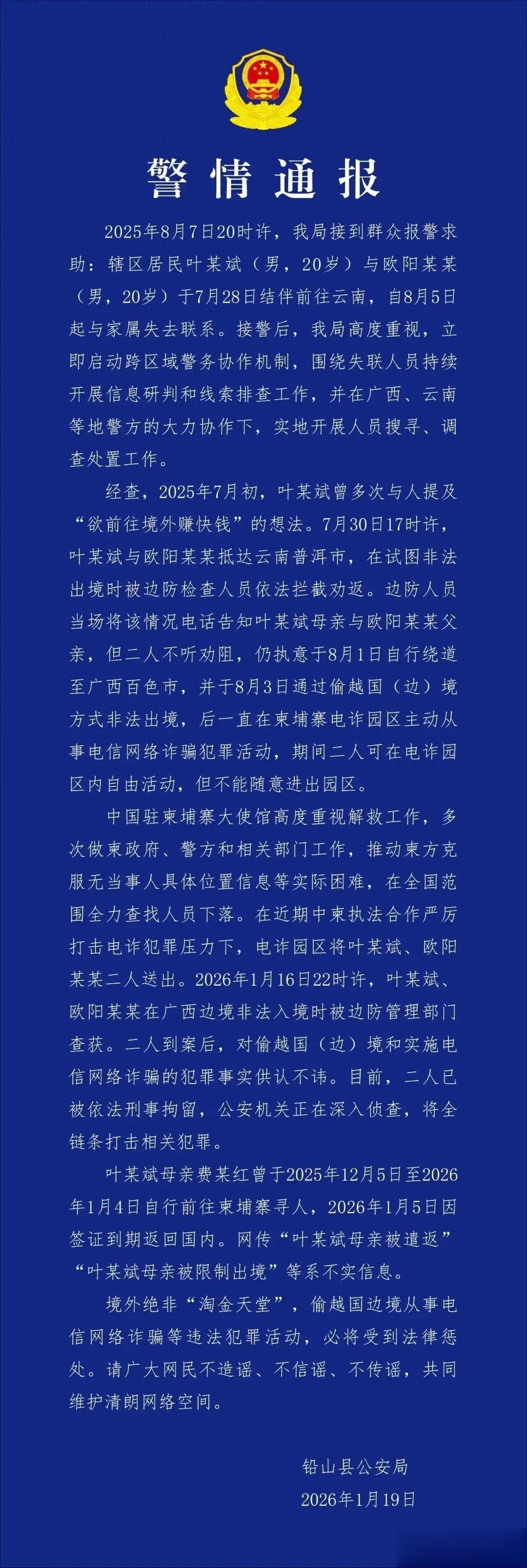 1月19日,一则警方通报击碎了全网对“19岁叶某斌被骗柬埔寨电诈园区”的同情。
