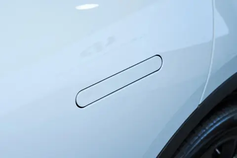 车身侧面,腰线从前翼子板缓缓上扬至尾灯,勾勒出一种“蓄势待发”的动感。悬浮式车顶 + 隐藏式门把手:黑色涂装的A/B/C柱营造出强烈的悬浮感,搭配全系标配的隐藏式门把手,关门时“咔哒”一声自动吸附,G级感瞬间拉满。还有小细节,增程器进气口被巧妙地隐藏在前翼子板后方的导流口中,不仔细看几乎发现不了,真正做到了“油电融合,视觉统一”。