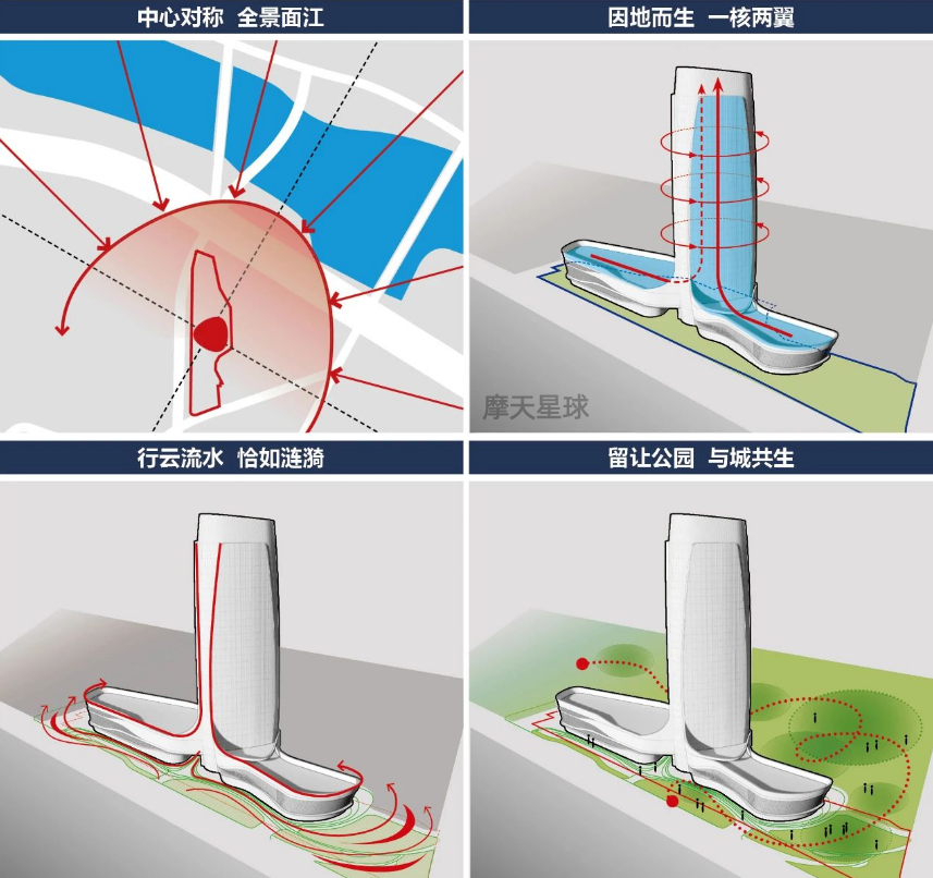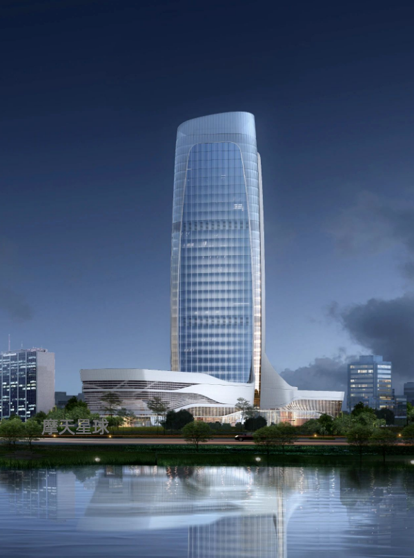 主楼采用钢框架结合核心筒结构,平面呈圆弧三角形,轮廓柔和优雅,与展开的裙房共同构成“一核两翼”的空间格局,隐喻企业发展的战略布局。