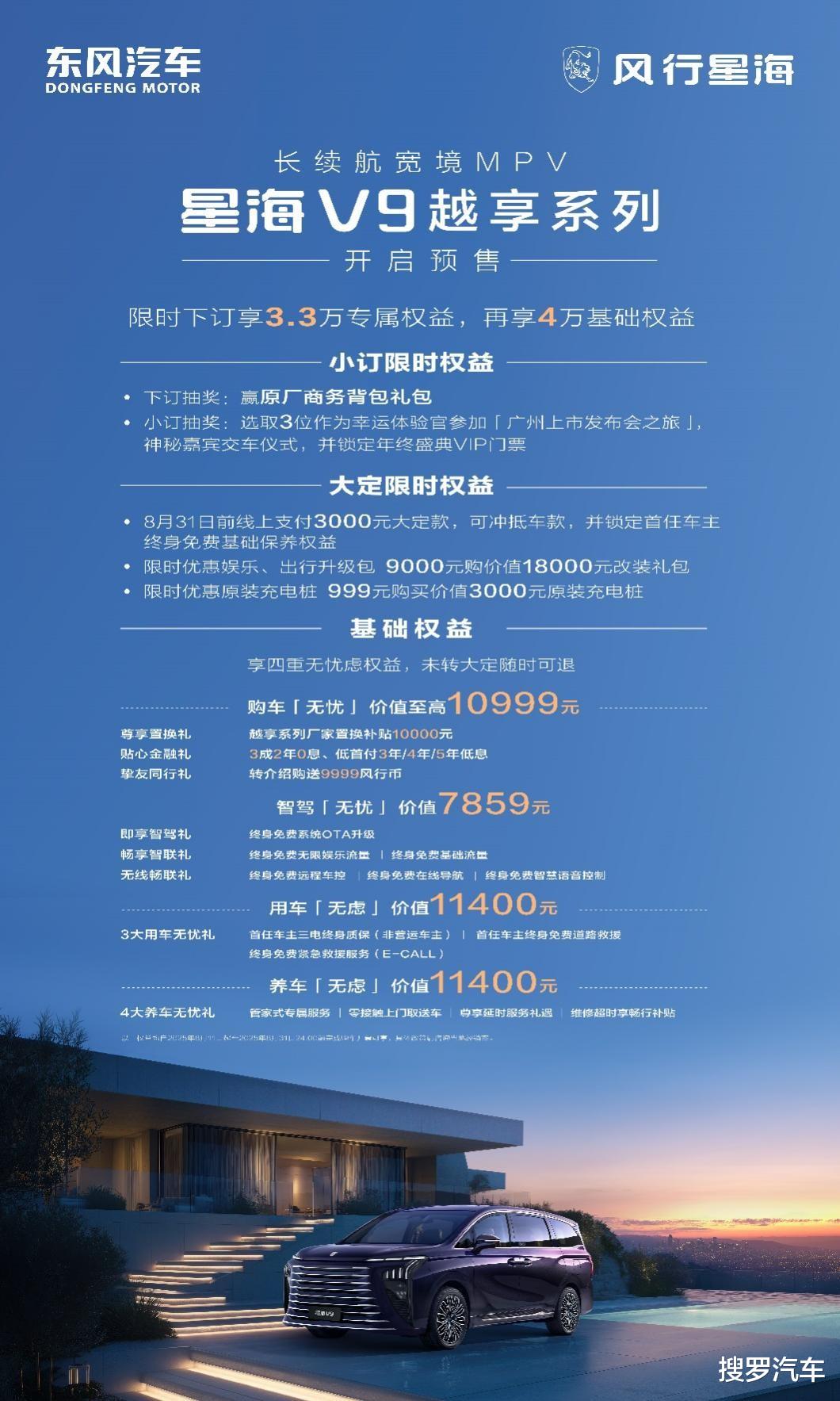 2025年8月11日,东风风行星海V9越享系列正式启动预售,以19.99万元预售价成为20万内首款中大型插电混动MPV。新车在续航、空间、品质等维度全面超越同级燃油MPV,以“燃油车价格,新能源体验”终结20万内MPV市场的燃油车垄断格局。