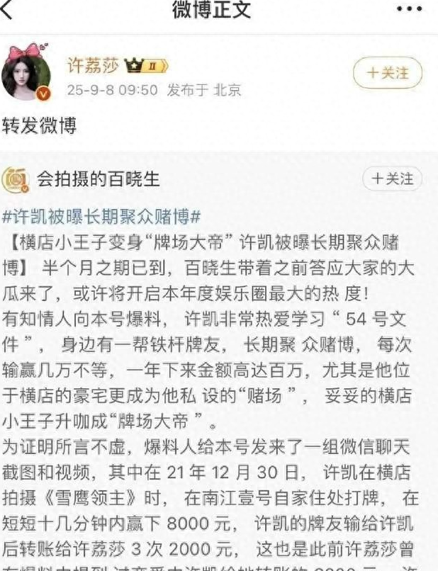 更离谱的是后面的微信截图。爆料的人晒了七八张转账记录,有许凯转给别人的,也有别人转给他的,金额都挺有意思,不是 5200 就是 8800,还有 13140 的,备注里写着 “补昨晚的数”“今天手气差”,转账时间大多在凌晨一两点,跟视频里牌局的时间能对上。最让人惊掉下巴的是个叫许荔莎的女生,直接发了条长文,说自己之前跟许凯处过半年对象,有一次许凯让她转 6000 块给一个姓王的朋友,她当时没多想就转了,后来才从别人嘴里知道那是 “赌资周转”。现在她因为这事天天被许凯粉丝骂,私信里全是 “蹭热度”“撒谎精”,逼得她没办法才把聊天记录晒出来,还说 “要是造谣,我愿意负法律责任”。