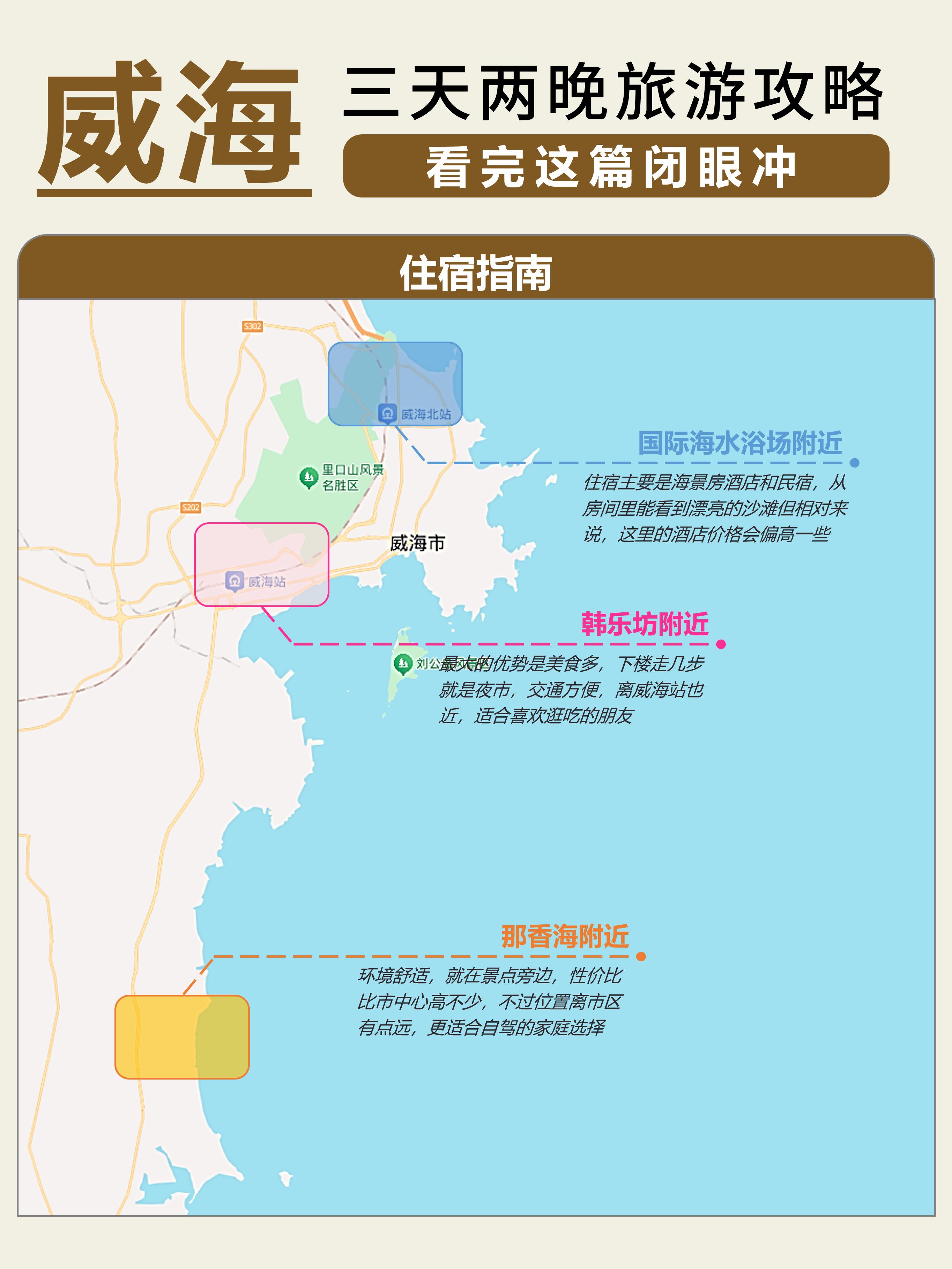 1.韩乐坊附近:最大的优势是美食多,下楼走几步就是夜市,交通方便,离威海站也近,适合喜欢逛吃的朋友