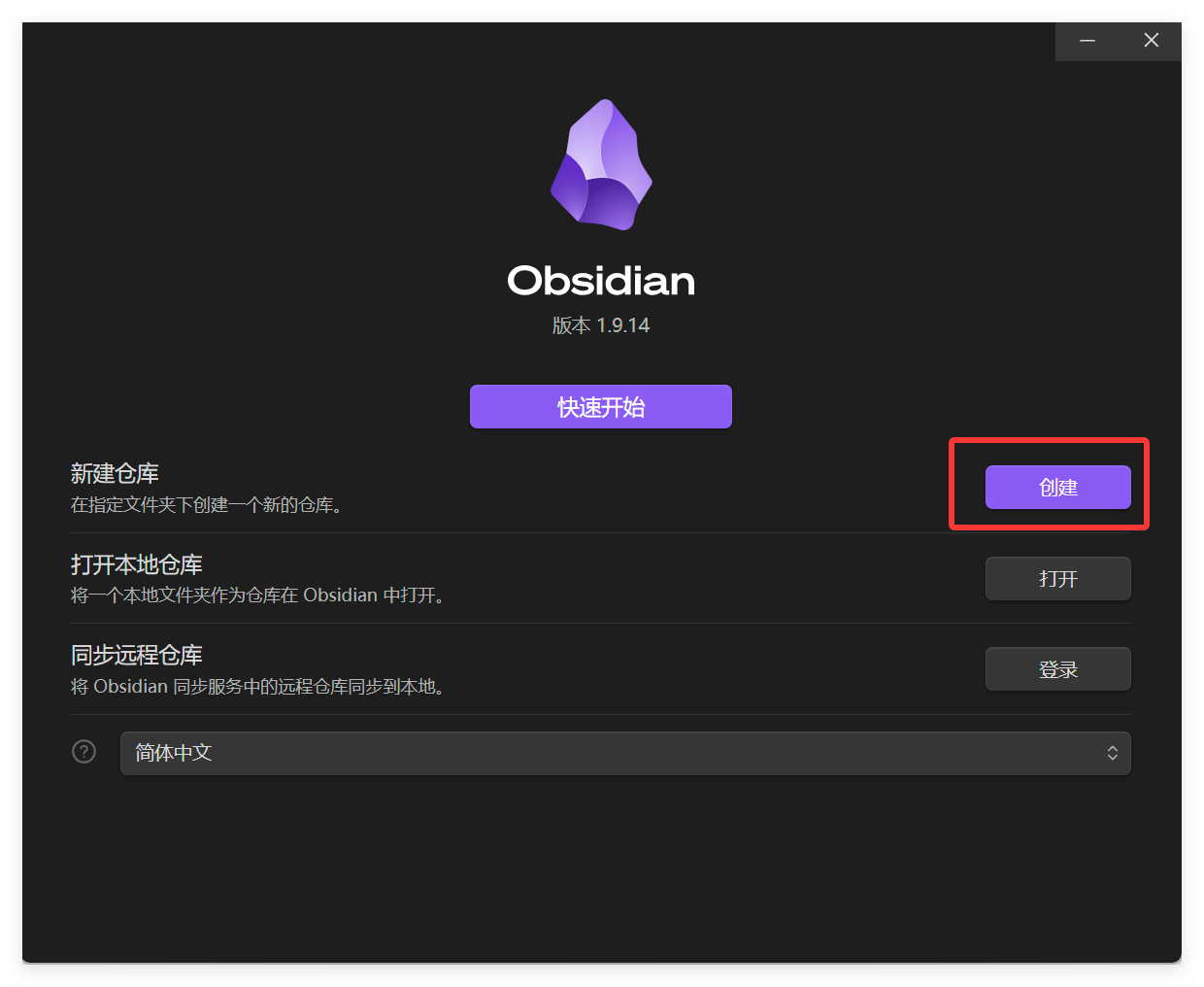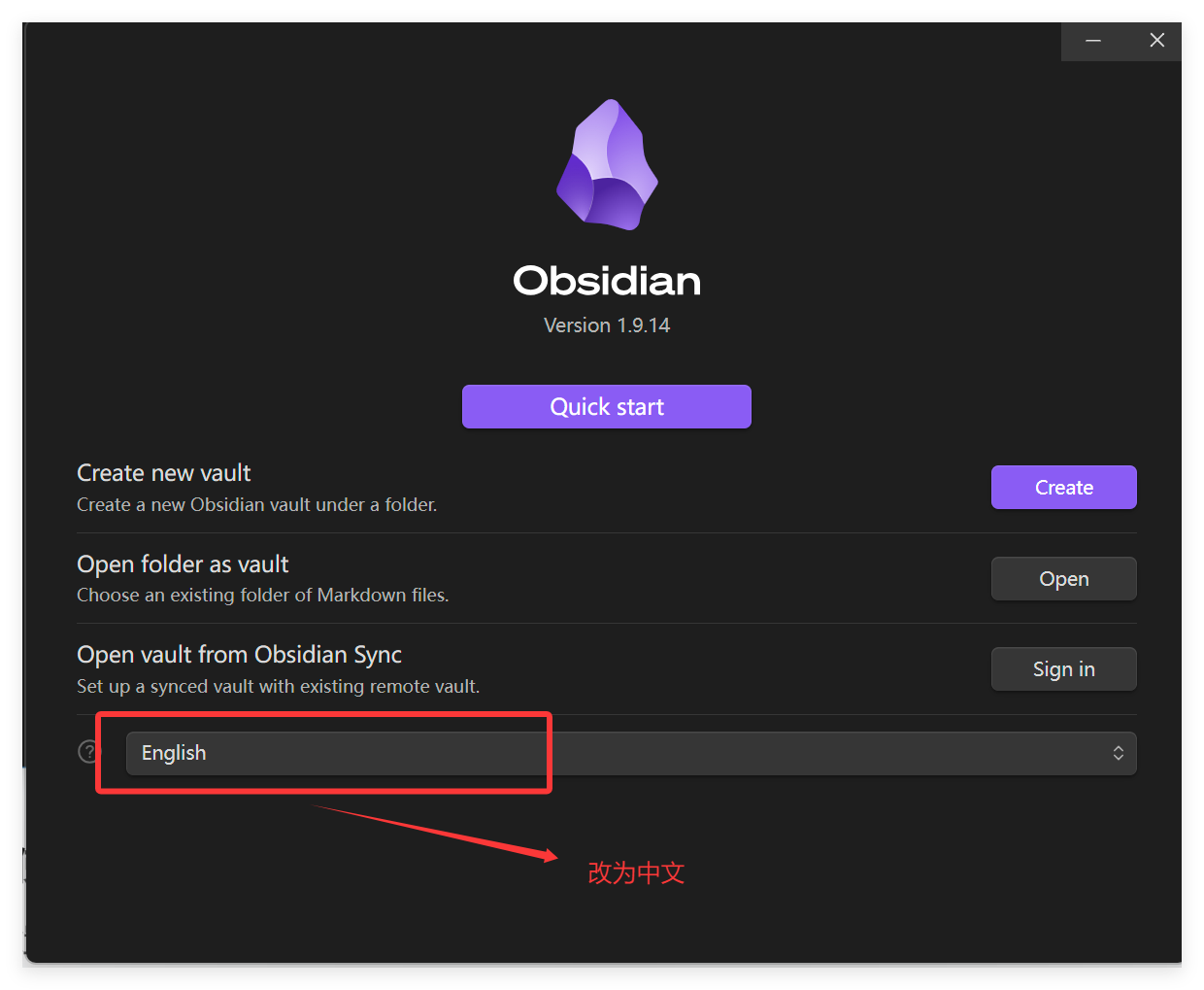Obsidian 默认的语言为英文,因此需要修改为中文。修改方式是在打开的主页面中点击下图所示位置: