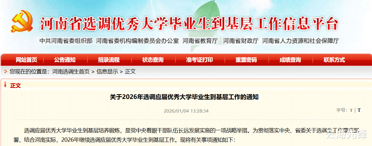 近日,中共河南省委组织部、河南省机构编制委员会办公室、河南省教育厅、河南省财政厅、河南省人力资源和社会保障厅联合发布《关于2026年选调应届优秀大学毕业生到基层工作的通知》,明确2026年计划选调1268名应届优秀大学毕业生到基层培养锻炼,其中普通类选调生1104人、法检专项选调生164人。