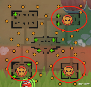 在开局的时候,我们就可以紧紧盯着左上角的小地图,地图上橙色的小点,就是常规的野怪资源点,别看很常见,但它们却是开局阶段玩家们的重点资源之一。通过击败小野怪来获得战场积分,并获得至关重要的天赋蘑菇。