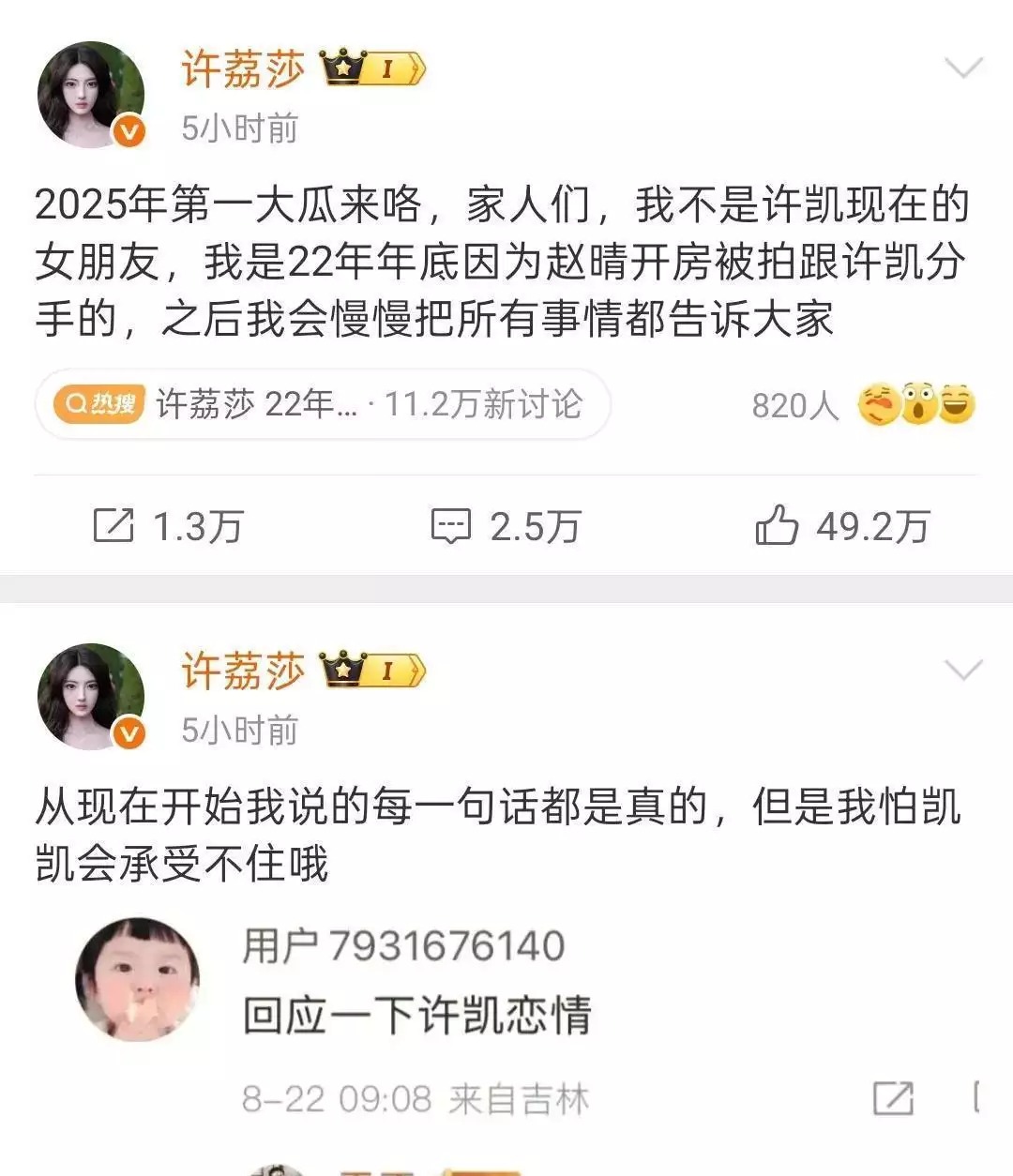 许荔莎发文称因赵晴介入而和许凯分手,结果许凯、赵晴两方几乎同时回应,否认指控,言语清晰,不拖泥带水。