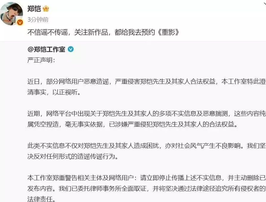 郑恺小姨子被传刷岳母的卡“消费八万元购买奢侈品”,这种家长里短的传言,郑恺夫妇及当事人很快共同发声否认,并透露已对不实信息采取法律手段。