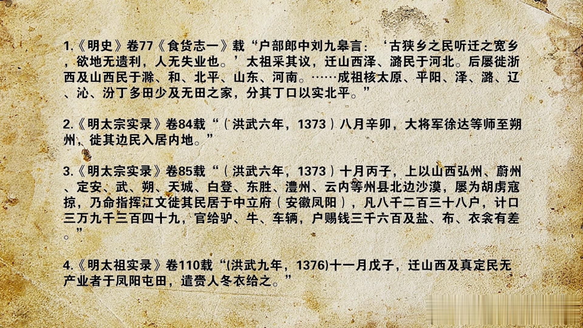 反倒是好像是在1957年,具体时间记不太清了,当时洪洞县跟赵城县合并而成的洪赵县人民政府就发了个文,说那么多族谱说出自洪洞,但是我们洪洞不可能迁出去这么多人,言下之意大家别热脸贴冷屁股了。人家山西都在辟谣,我就不明白那些山东、河南、河北人为什么还这么热衷上杆子,哭错了祖坟还嘻嘻恬不知耻,我说“认贼作父”有点不厚道,意思是这么个意思。