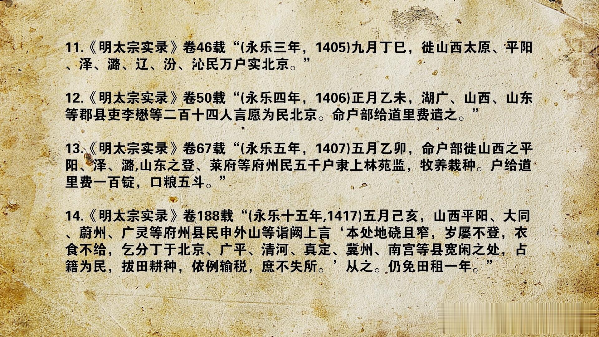 再者,明朝初年的山西移民是被迫的还是自愿?真是被绑着去的吗?下面是山西师范大学仝建平教授根据《明实录》《明史》整理的明朝初年山西移民情况,共14条: