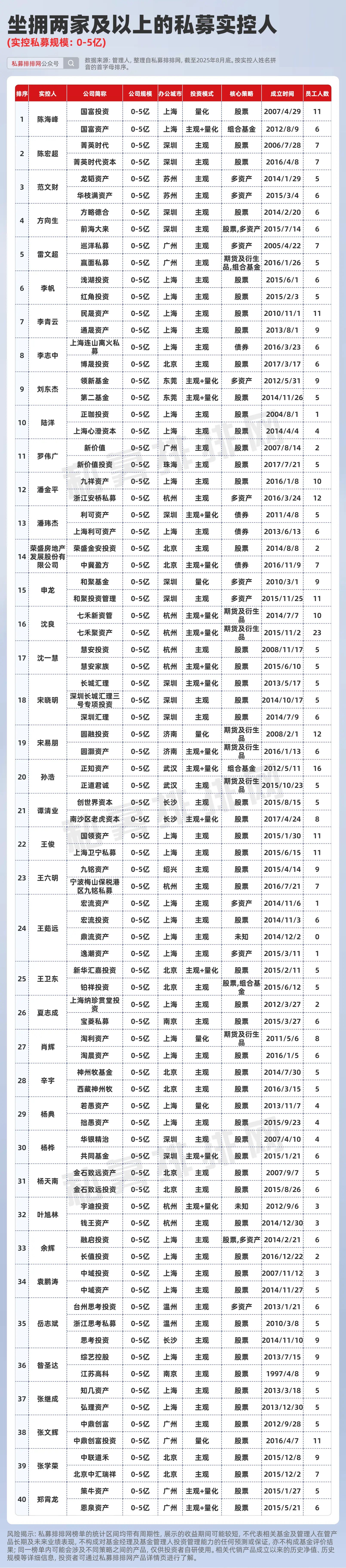 私募排排网数据显示,同时实控两家及以上私募,并且旗下私募规模均0-5亿的实控人共40位。