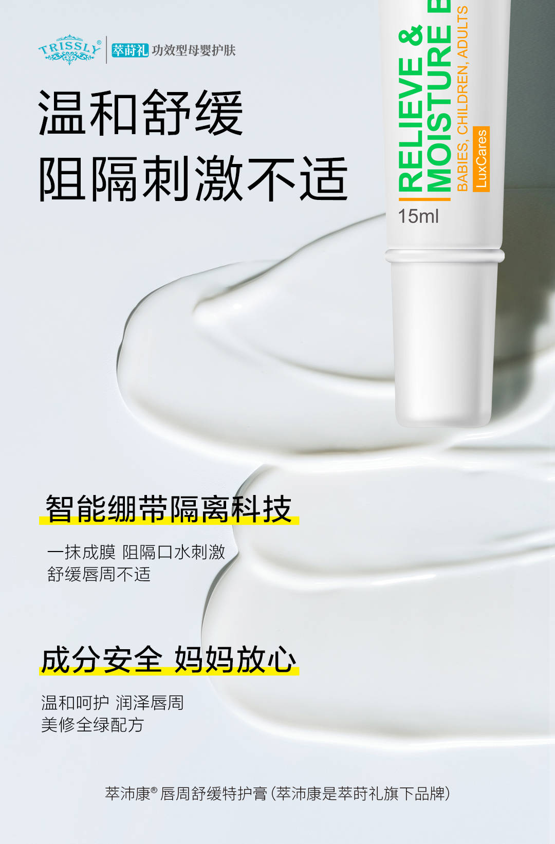 做好防护需要选对专门的唇周护理产品,重点看三个关键点:成分安全、能隔离刺激、能修复保湿。优先选儿童专用的产品,无激素、无防腐剂、无香精色素,原料温和不刺激,就算宝宝不小心舔到也不用担心。同时,产品要能快速成膜,形成隐形保护膜,挡住食物汁水和口水的侵蚀,还得有保湿和修复成分,帮助补充皮肤水分、修复受损的角质层。