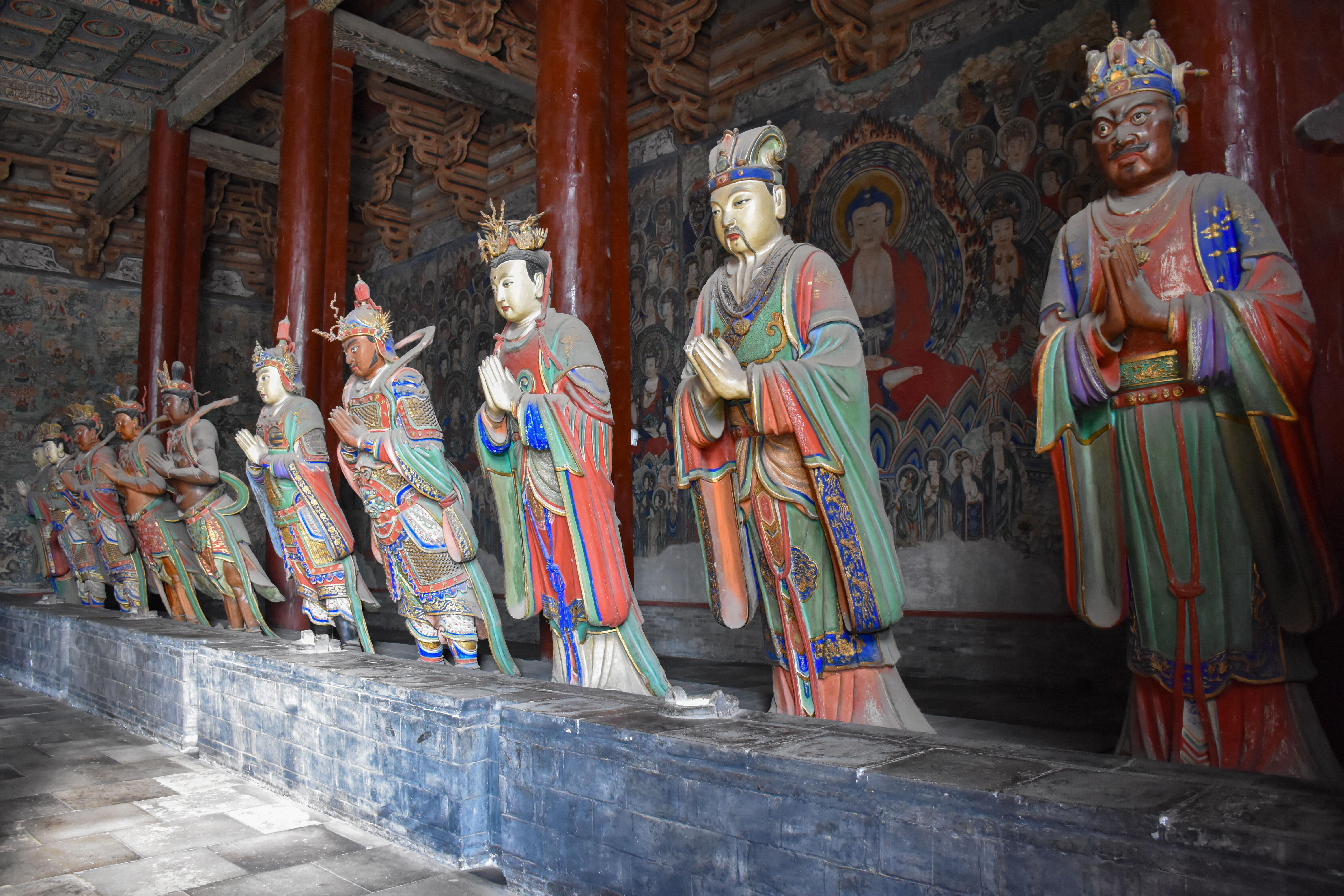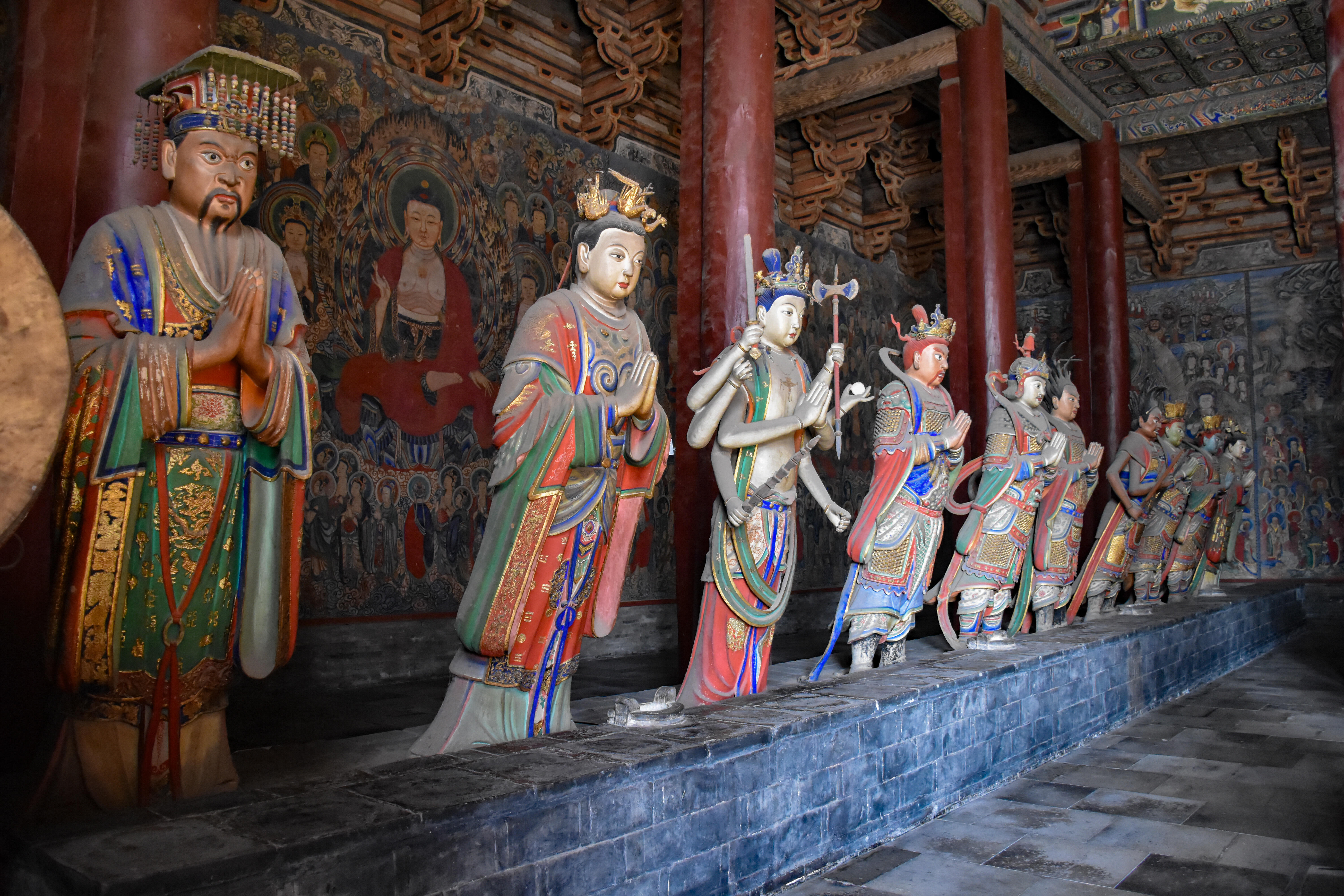 殿内的砖砌佛坛上,五尊明代彩塑五方佛静静端坐。中央的毗卢遮那佛、东方的阿閦佛、南方的宝生佛、西方的阿弥陀佛、北方的不空成就佛,分别代表着不同的佛国世界,佛像高达数丈,神情庄严肃穆,衣袂线条流畅自然,色彩虽经岁月侵蚀,却依旧鲜艳夺目。每一尊佛像都比例匀称、形神兼备,眼神慈悲而深邃,仿佛能洞察世人的心事。围绕着五方佛,两侧的二十诸天造像姿态各异,有的怒目圆睁,有的慈眉善目,每一尊都个性鲜明,将神话中的诸天形象刻画得栩栩如生。这些明代彩塑,虽不是大殿最初的遗存,却与金代的殿宇完美融合,形成了独特的艺术景观。