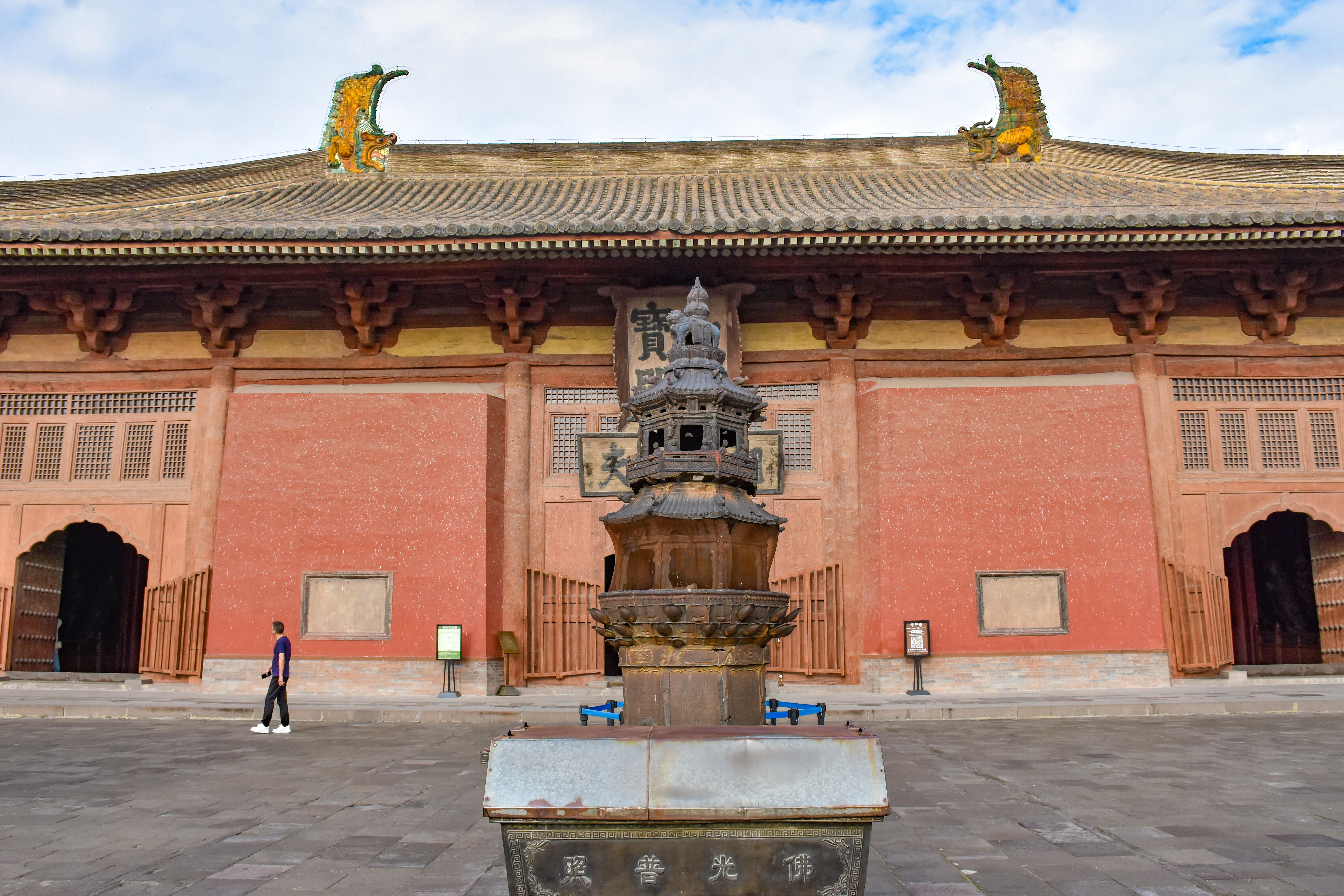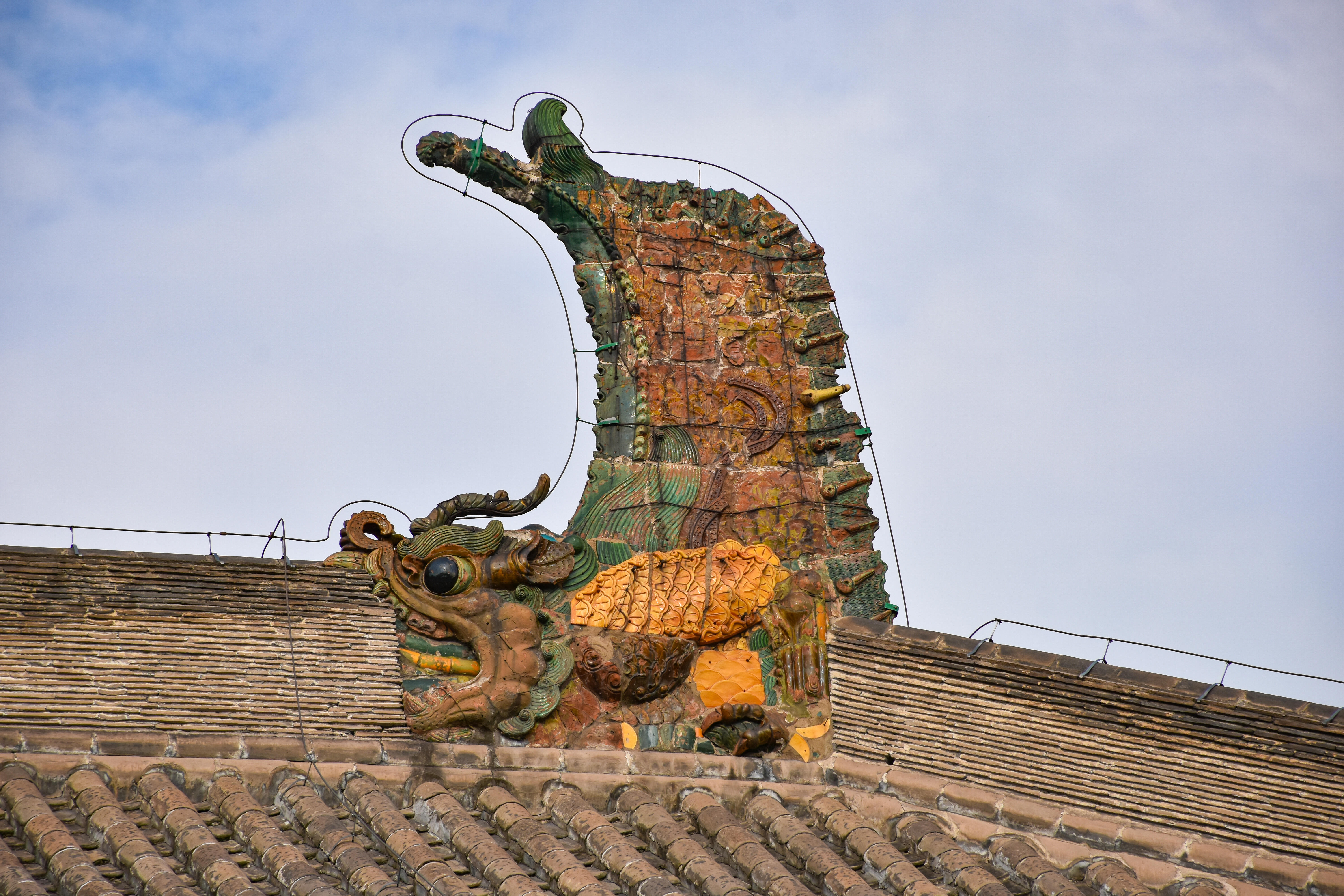 最引人注目的,莫过于大殿北端那尊高达4.5米的鸱吻。作为金代留存的原物,它历经近九百年风霜,依旧完整地矗立在屋脊之上,琉璃釉色虽有些许斑驳,却依旧难掩当年的光彩。鸱吻造型雄浑,曲线流畅,头部微微上扬,仿佛在守护着这座千年古刹。要知道,在古代建筑中,鸱吻不仅是装饰构件,更被认为有镇火避灾的寓意,而这尊金代鸱吻能完好保存至今,本身就是一件奇迹。站在台下仰望,它像一位沉默的哨兵,见证了大殿从金代重建到如今的风雨变迁,也见证了大同这座古城的兴衰荣辱。