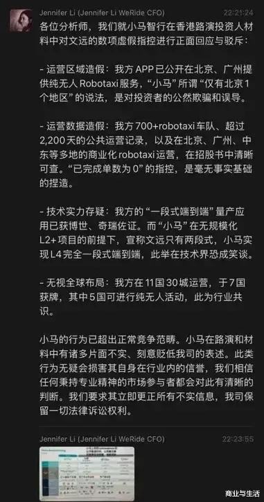 近日,文远知行CFO李璇在朋友圈及分析师群里发布长文,公开指责小马智行IPO路演材料中有诸多片面不实、刻意贬低文远知行的表述,包括运营区域造假、运营数据造假、技术实力造假、无视全球布局等。李璇表示,小马的行为已超出正常竞争范畴。