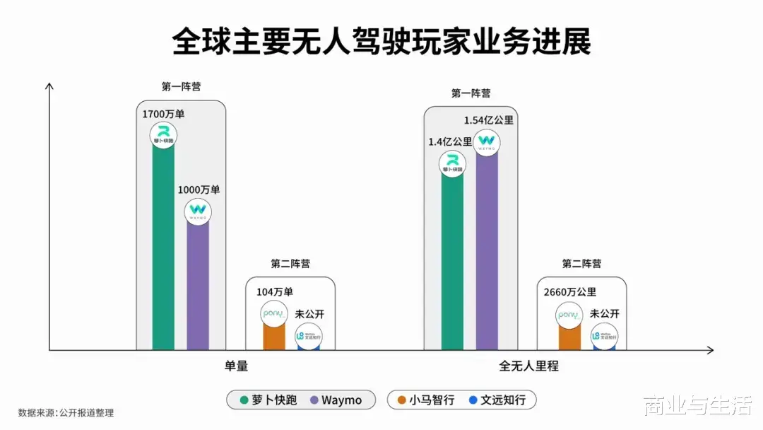 与小马智行、文远知行等第二阵营玩家形成鲜明对比,萝卜快跑和谷歌Waymo已在全球形成了绝对领先的优势。目前,萝卜快跑自动驾驶总里程已超过2.4亿公里,其中全无人驾驶里程已突破1.4亿公里;谷歌Waymo的全无人驾驶里程则为1.54亿公里。