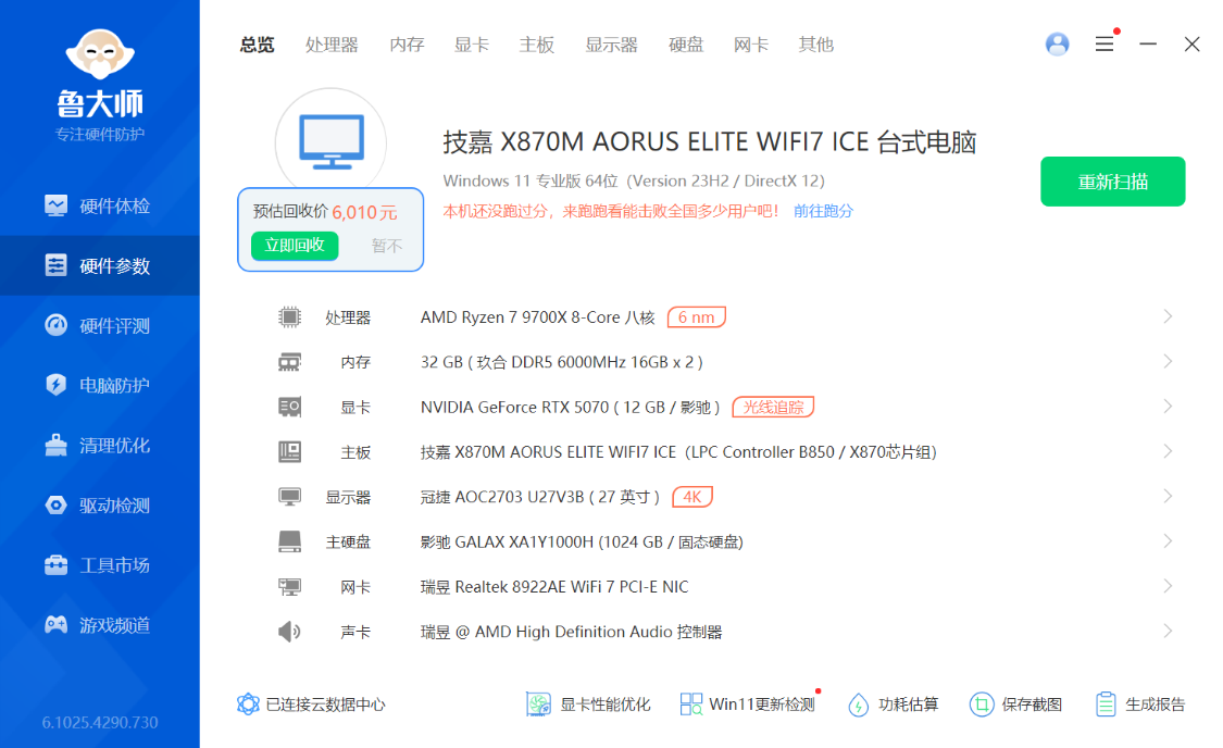测试平台配置:AMD R7-9700X处理器、技嘉X870M AORUS ELITE WIFI7 ICE主板、影驰RTX5070金属大师白金版OC显卡、玖合DDR5-6000 CL28 异刃RGB灯条、星曜7000 Plus 1T M.2固态硬盘、利民绝双刺客Peerless Assassin 140 Digital WHITE 全白数显版风冷、乔思伯D200白色M-ATX曲玻机箱、影驰金属大师GL-850白色金牌全模组电源、影驰魅影风扇4正+3反。