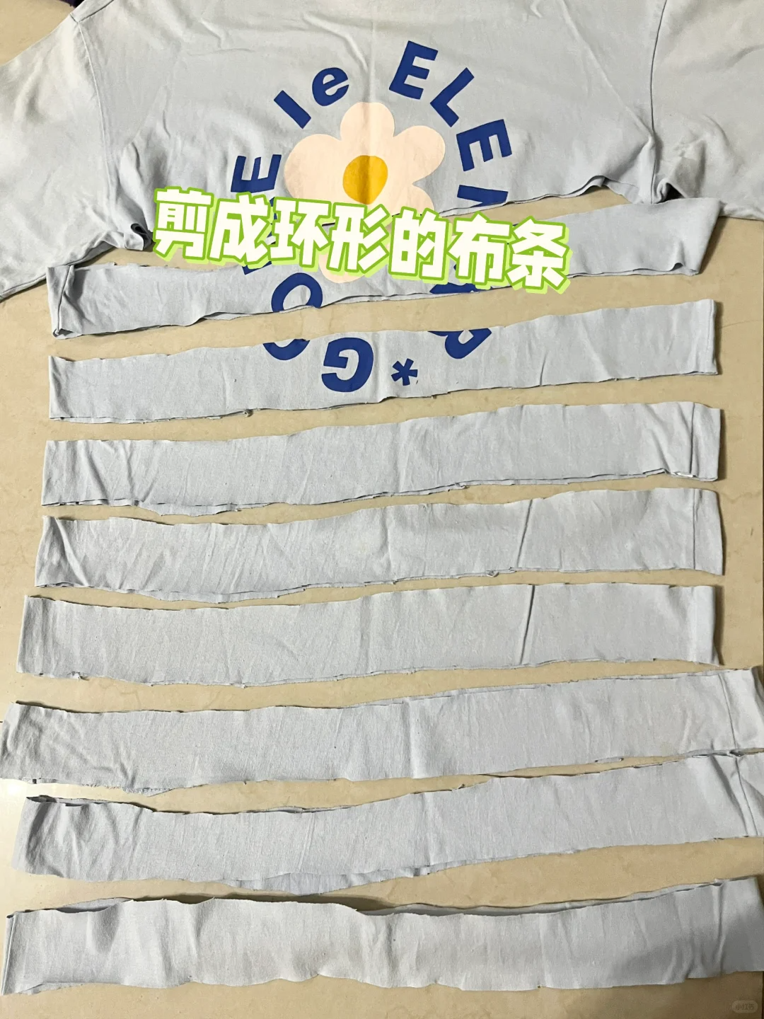 如果家里有很多不穿的旧t恤,也可以将这些旧T恤改造手工帝地垫,方法很简单,将这些旧t恤裁剪成长条状,然后再将它们编织起来就可以了,在中间的位置用针线固定一下。