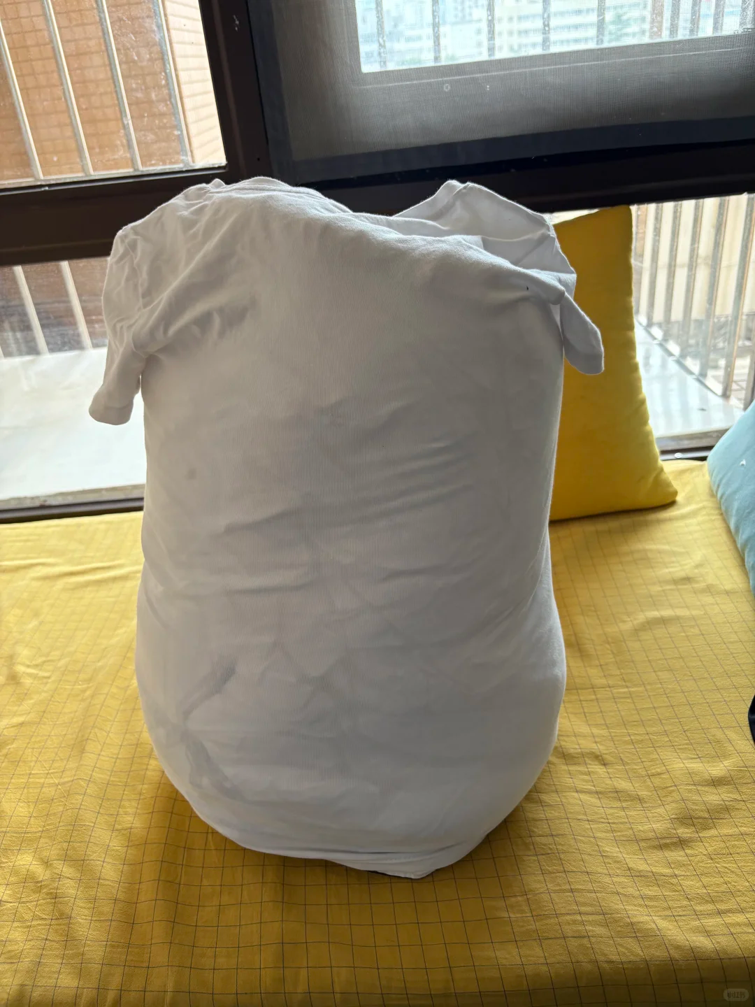 家里不用的被子卷起来之后直接套上t恤,这样不会太紧,把被子压的不保暖,也不会太松,放在柜子里一点都不占地方。
