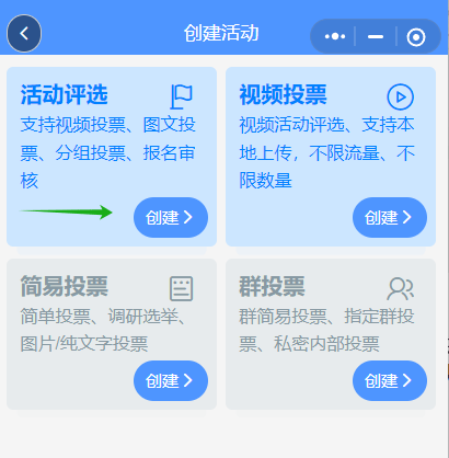进到主页面后,一看就能看到"创建投票"的大按钮,点进入。校园摄影投票选用"活动评选"这个模板(不知道选哪个可以提前问在线客服,真人一对一服务),这个是通用模版,做摄影投票活动非常合适,可以放图片或者视频。