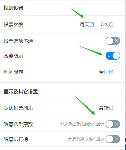 投票规则必须好好设置:投票次数设置,特意设置了“每人每天限投3票”单选多选都能设置,可以按自己想法来设置,非常灵活。必须把智能防刷软件打开,开了验证码+限制IP地址等限制,就能防止有人刷票了。