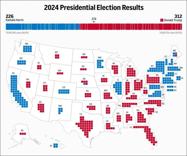 11月10日,随着最后一个摇摆州亚利桑那州选票测算结果公布,全球瞩目的美国大选终于尘埃落定,特朗普以312张选举人票胜选,哈里斯则获得226张选举人票。