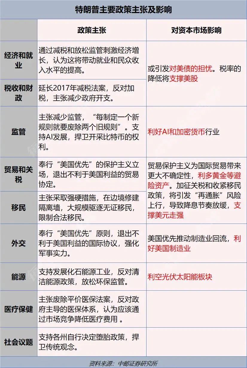 根据此前竞选策略,下一任期,预计特朗普仍然坚持“美国优先”理念,重视美国经济增长与制造业繁荣。其实现经济目标的核心抓手包括:放松监管、减税、贸易保护与供应链回流、增加低成本能源供给、提倡创新等。