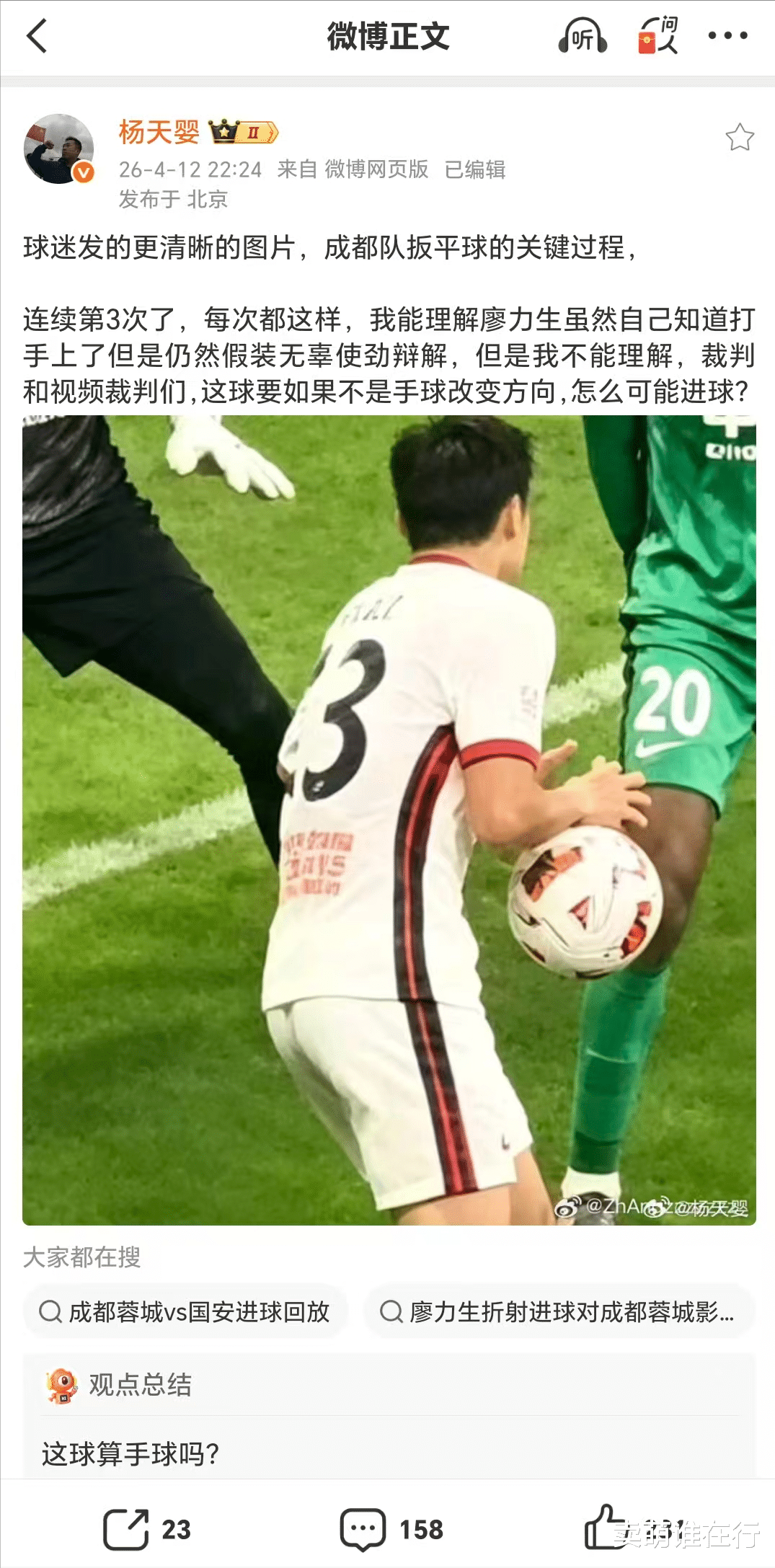 在当天比赛结束之后,包括北京台天天体育栏目主编王速,中国体育报媒体人杨天婴在内的多名北京知名媒体人以及部分国安博主,用了一张廖力生手球的图,但那张图上廖力生的右手有6个手指(王速已经删了微博,杨天婴到现在也没删)。当北京的媒体都能拿廖力生右手有6个手指的图来说事,那就说明北京台也好,国安俱乐部官方镜头也罢,恐怕没有找到能够证明廖力生手球的直接证据。