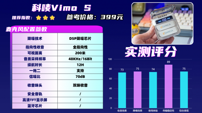 该产品采用发射器内置接收器的一体化设计,支持48kHz/24bit高清音频,信噪比达70dB,最大声压115dB,搭载一键动态降噪和150Hz低切滤波,人声清晰不爆音,音质表现稳定。