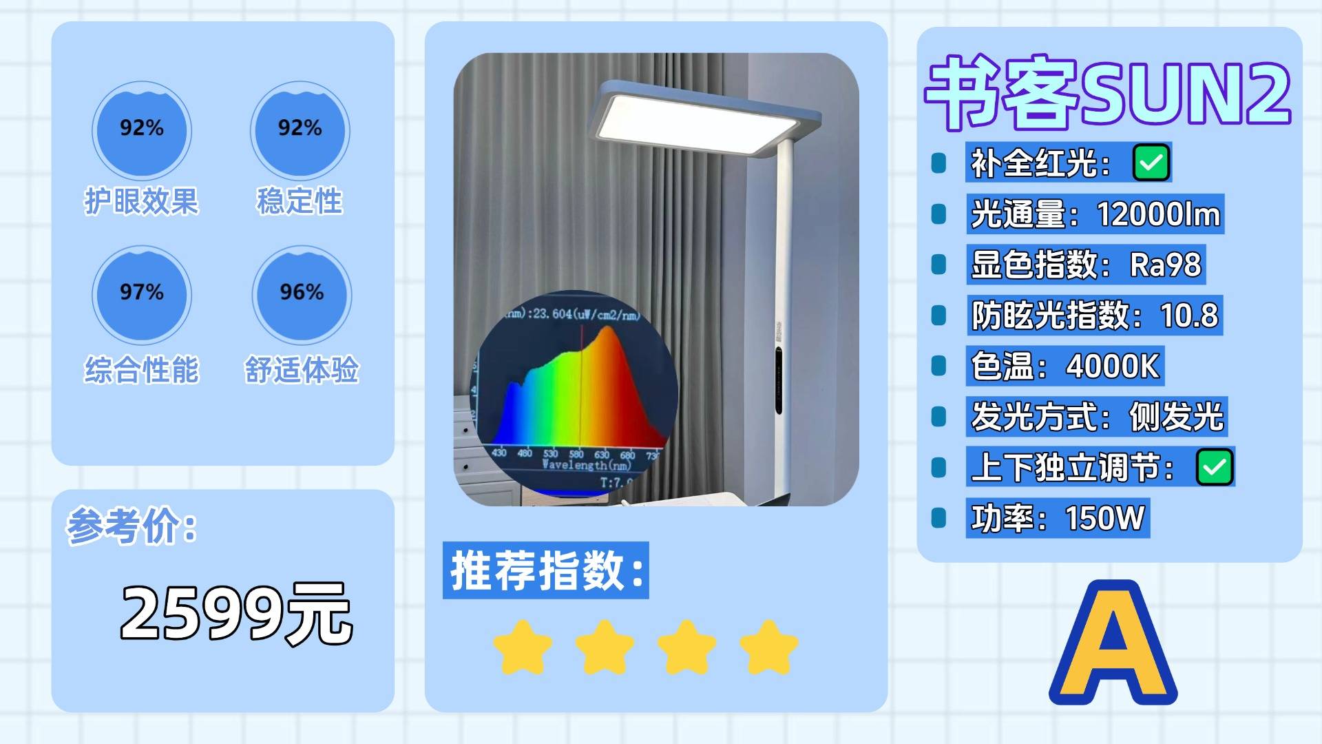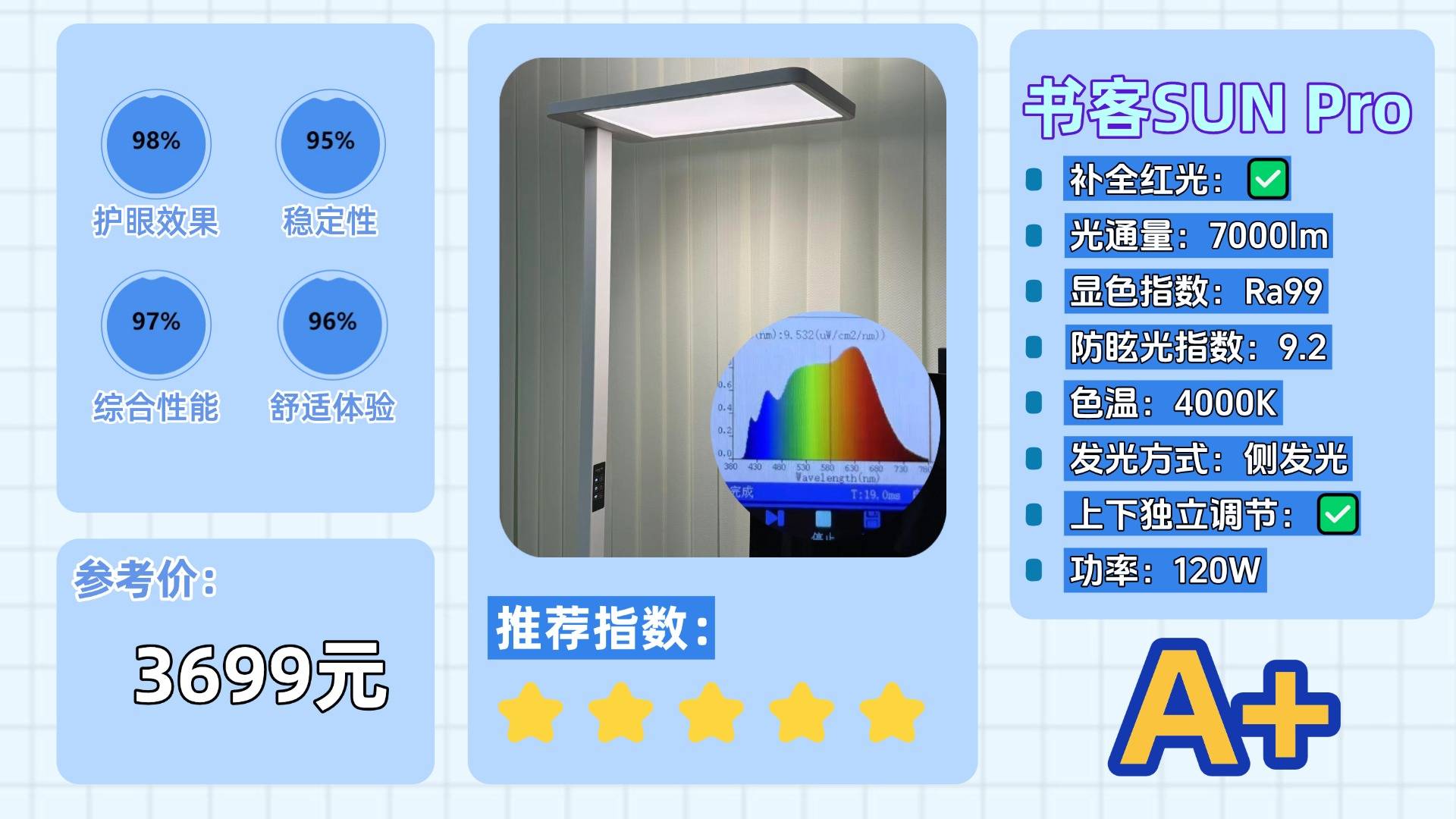 并在护眼养眼的核心技术上,书客突破性研发RRT2.0红光养眼技术,精准拦截380-455nm高能有害蓝光,同时大幅增强有益红光波段,从源头优化光环境,有效减少98%的近视风险,还采用德国进口BASF眩光抑制膜,约640万个微米级透镜结构精准偏转大角度光线,大幅削减眩光效应,实现了低眩光等级(UGR ≤ 9.2),使光线更加柔和均匀!