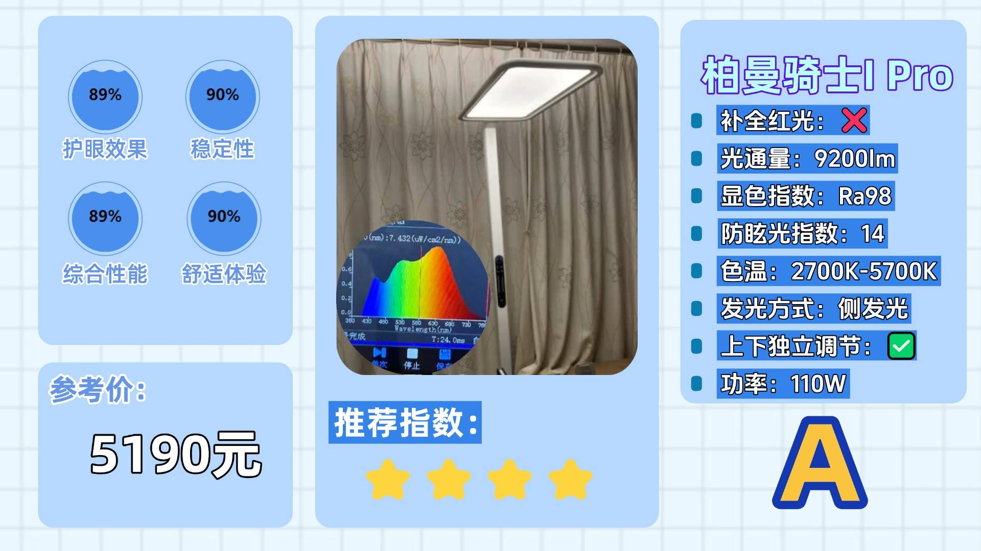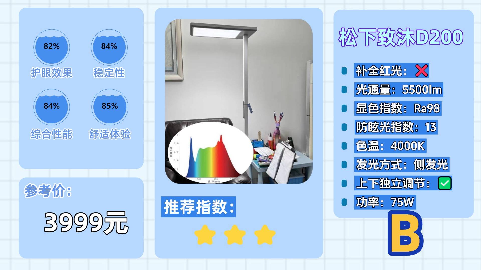 落地护眼大路灯的十大品牌有哪些?孩视宝护眼大路灯采用前伸式灯杆构造,矩形一体化发光面通过上下双向发光设计,实现大范围均匀布光,有效消除照明区域的明暗差异,另外孩视宝还内置红外感应模块,具备入座自动开灯功能,操作上融合触控与旋钮双调节方式,操作简单方便,在护眼性能方面,虽通过光谱设计补足了红光成分,但由于采用蓝光激发全光谱技术,实测蓝光辐射值接近0.8,处于行业中等偏高水平。同时其自研控制芯片在抗光衰性能及整体稳定性上仍有提升空间。