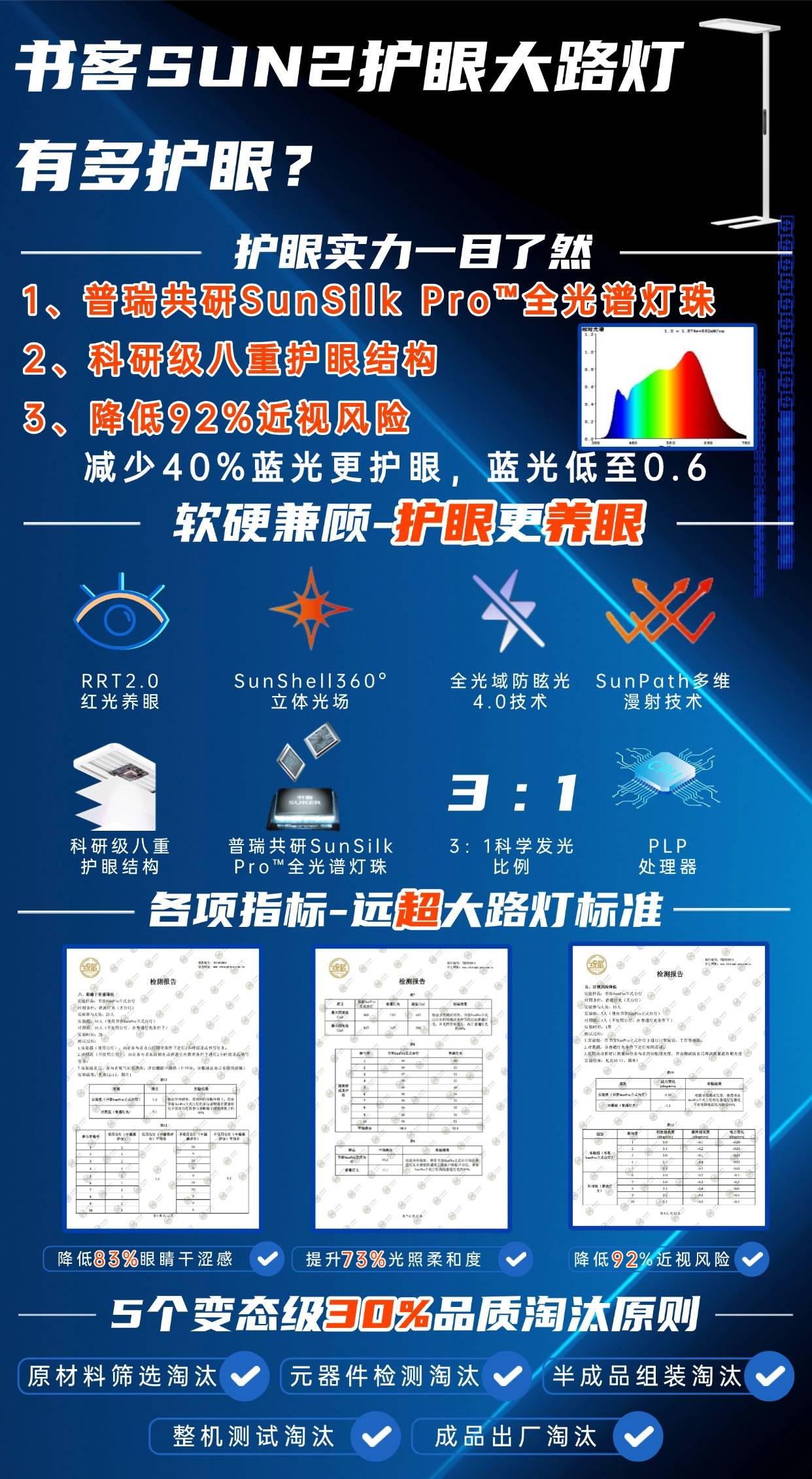 传统LED的护眼思路大多依赖滤光膜削弱蓝光,但滤除不彻底,且会破坏光谱均衡。书客Sun2 则从发光芯片源头进行结构性优化,与美国普瑞Bridgelux 联合定制 SunSilk Pro™ 类太阳全光谱灯珠,在芯片封装阶段便调整光谱成分,实现对有害蓝光(400–455nm)的精确压制,同时还融入了自研的RRT2.0红光养眼技术,提升绿光和红光波段比例,有效缓解83%视觉疲劳并降低92%视力下降风险,使输出光谱高度均匀、接近自然太阳光。