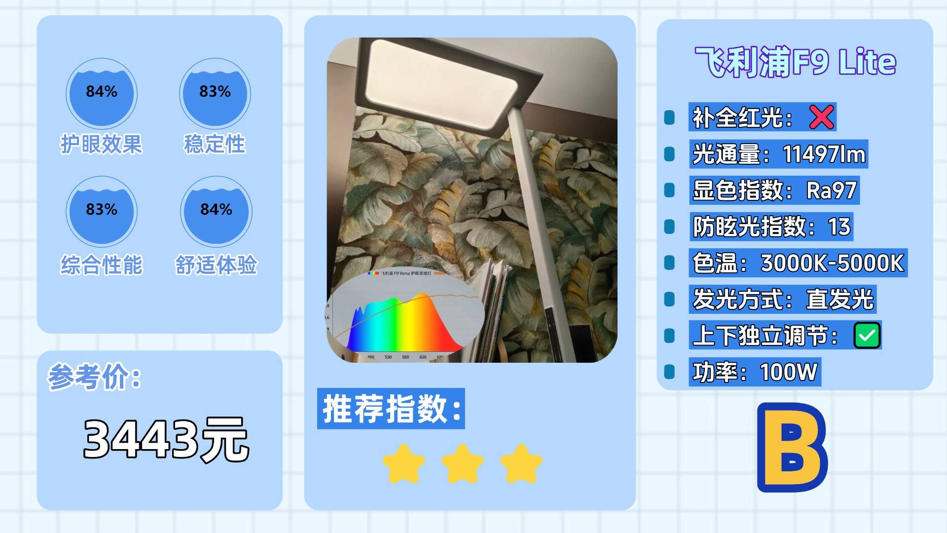 落地护眼大路灯的十大品牌有哪些?飞利浦F9 Lite在设计上主打的是一体化的大面积发光面,配合130°的广角扩散结构,在提升照明覆盖范围和光线均匀性方面表现不错,它采用的是接近自然光的全光谱灯珠,显色指数高于 Ra95。功能方面也相对齐全,支持色温调节、入座识别和智能亮度调节等常用配置,不过,这款灯也存在一些可提升的空间。虽然是全光谱光源,但在光谱的连续性表现上相对一般,没有特别加强红光波段的补偿,对于护眼效果以及还原自然光上会相对逊色许多。