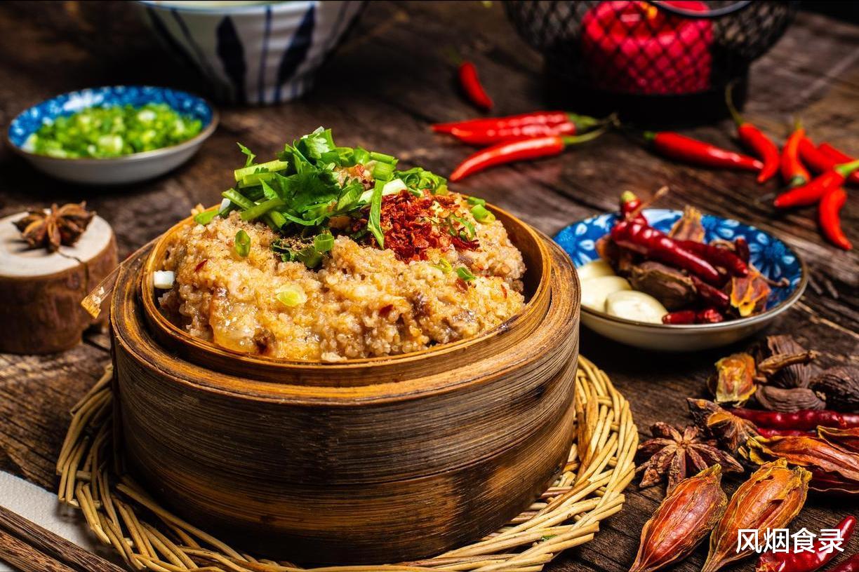 这菜讲究个“蒸蒸日上”,红白相间的五花肉裹着焦黄的米粉,底下垫着红薯或南瓜,寓意日子红火,是宴席上的硬角。
