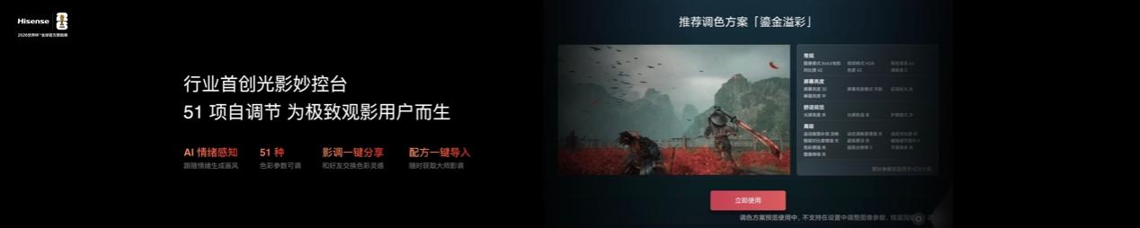 软硬件的深度协同,让海信E7S Pro适配多元使用场景,满足不同用户的个性化需求。针对影音发烧友,产品搭载行业首创的光影妙控台,开放51维色彩参数精细调节,支持AI视觉心理测试自动匹配调色风格,内置多位观影大咖的专业调色方案,一键即可复刻影院级画质,调出的专属风格还能生成方案码分享;炫彩刮削海报墙可直接读取NAS、网盘、USB中的影视资源,秒级刮削封面与简介,AI智能分类让影库井井有条。游戏模式下,电视可秒级识别主机设备,自动切换最优图像参数,独家分屏功能实现“边打游戏,边看攻略”,四路CEC联动让一个遥控器即可掌控所有设备,操作更便捷。此外,产品还支持Dolby Vision 2、Wi-Fi 6、LE Audio蓝牙低功耗音频等前沿技术,配备4GB+64GB超大存储,全方位覆盖观影、游戏、办公等生活场景。
