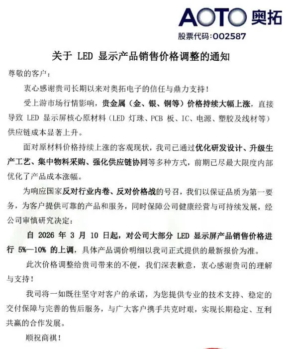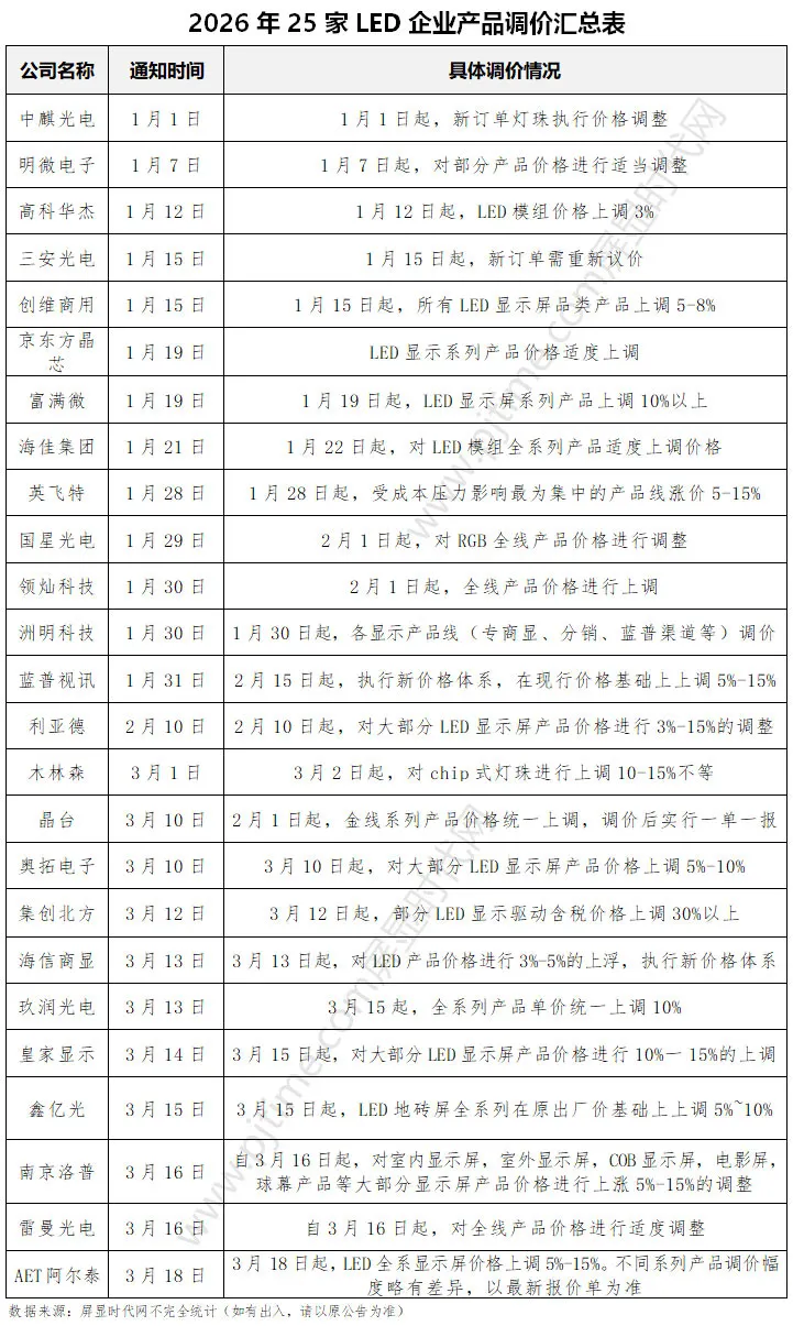 2025年四季度开始的LED行业“普涨”行情还在继续。继春节前洲明科技、利亚德、蓝普视讯、京东方、富满微、国星光电、三安光电、创维、富满微、明微电子发布调价通知后,3月份,又有奥拓电子、雷曼光电、海信商显、木林森、晶台、集创北方、南京洛普、玖润光电、皇家显示、鑫彩晨、鑫亿光等近15家LED企业发布调价公告。据屏显时代网不完全统计,截止目前,已有超60+LED企业披露调价通知。