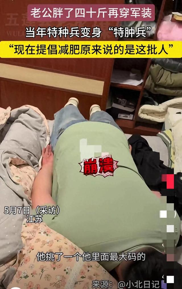 一男子闲着没事拿出自己退伍前的军装,信心满满的以为自己能穿上。