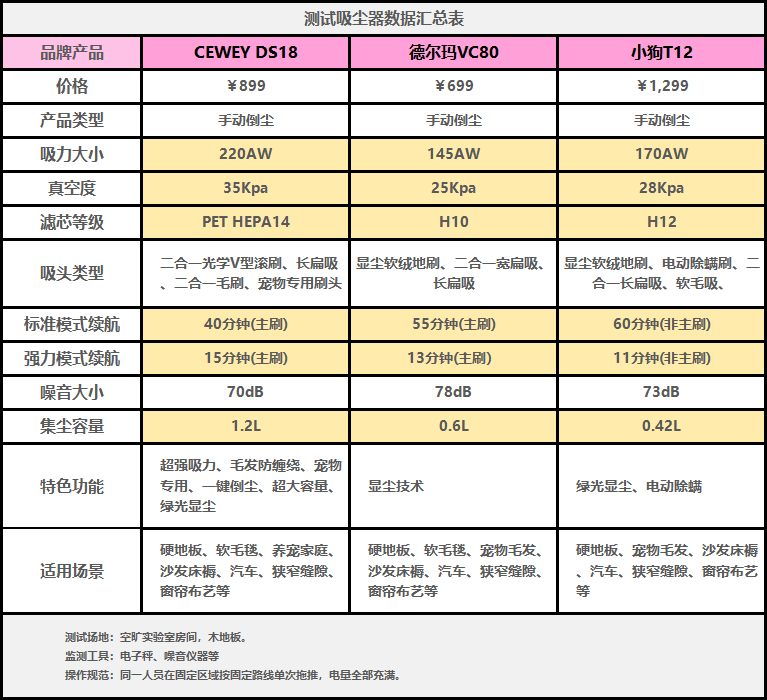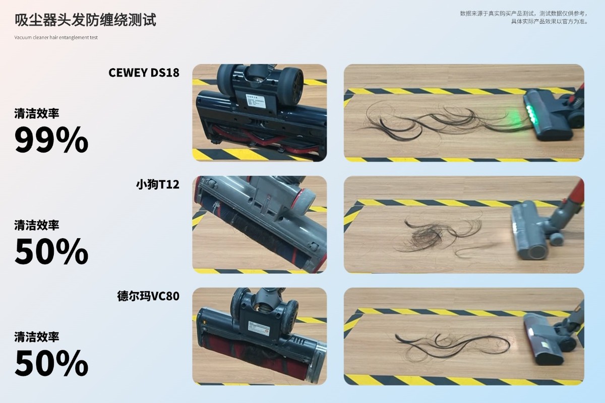 测试总结:防缠绕表现优秀:CEWEY防缠绕表现良好:小狗防缠绕表现一般:德尔玛在这项测试中,CEWEY DS18得益于防缠绕V型复合滚刷结构,清扫完基本没有出现残留情况,清理工作几乎可以忽略,使用体验轻松。小狗在应对长发时能吸走大部分毛发,但仍有少量缠绕,需要在清洁后用手取出几根,有点麻烦。追觅的缠绕情况相对明显,长发容易集中在滚刷中间,手动清理耗时较长,对于需要快速清洁的家庭是个不小的麻烦。