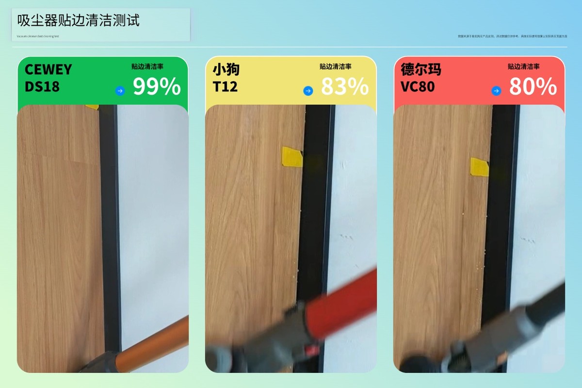 测试原理:大家打扫卫生时肯定都遇到过这种情况:用吸尘器推过去之后,墙角、踢脚线总是会留下一条扫不到的灰尘。久而久之就残留在缝隙中留下了很深的尘印。测试方法:测试方法很直接,我抓了一小把猫砂,沿着客厅墙边的踢脚线均匀地撒了一条线,用来模拟日常生活中最容易出现在墙角的垃圾。然后每台吸尘器按照统一标准匀速推扫一次,观察贴边区域是否清洁干净,同时做好记录。