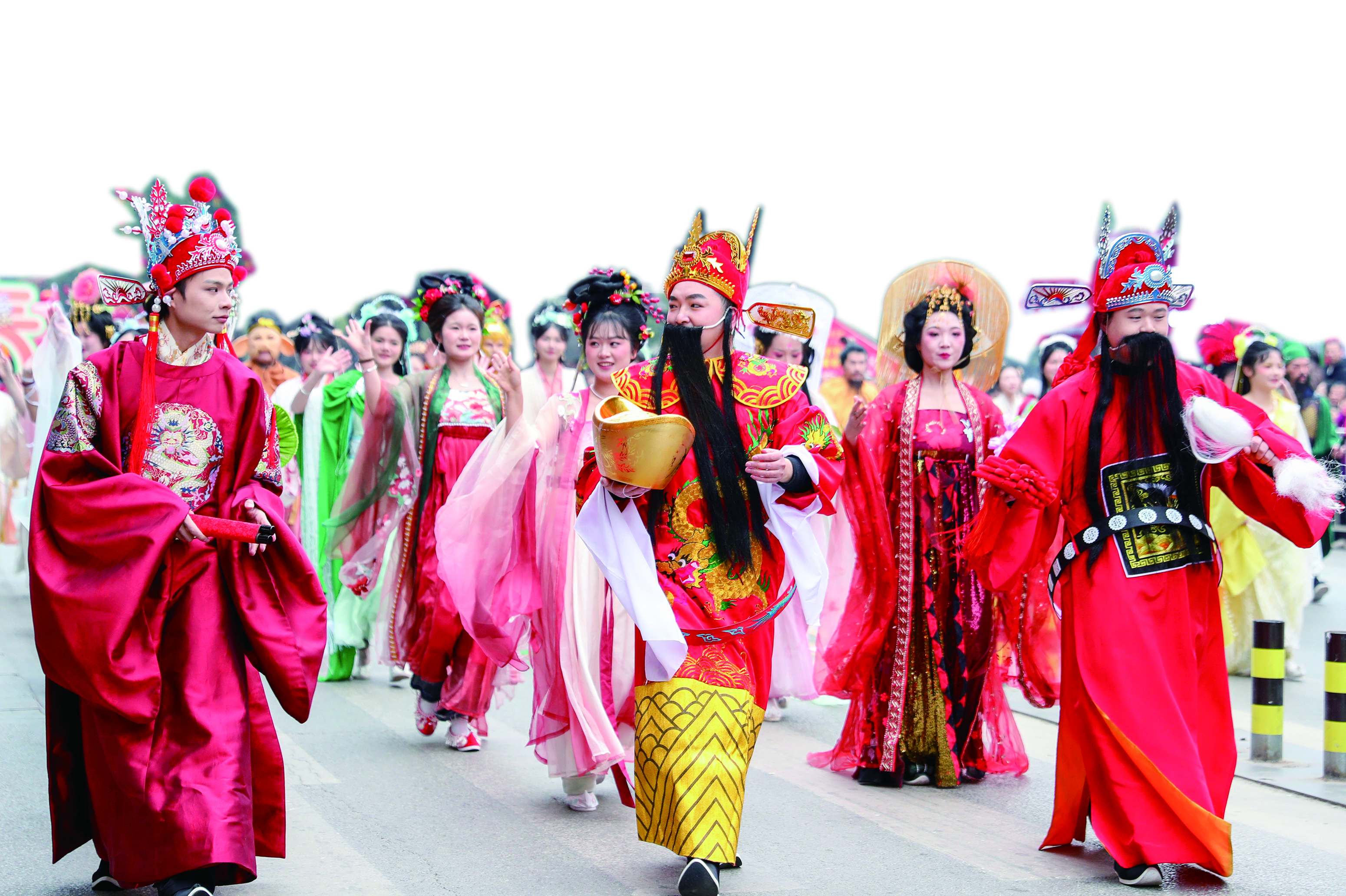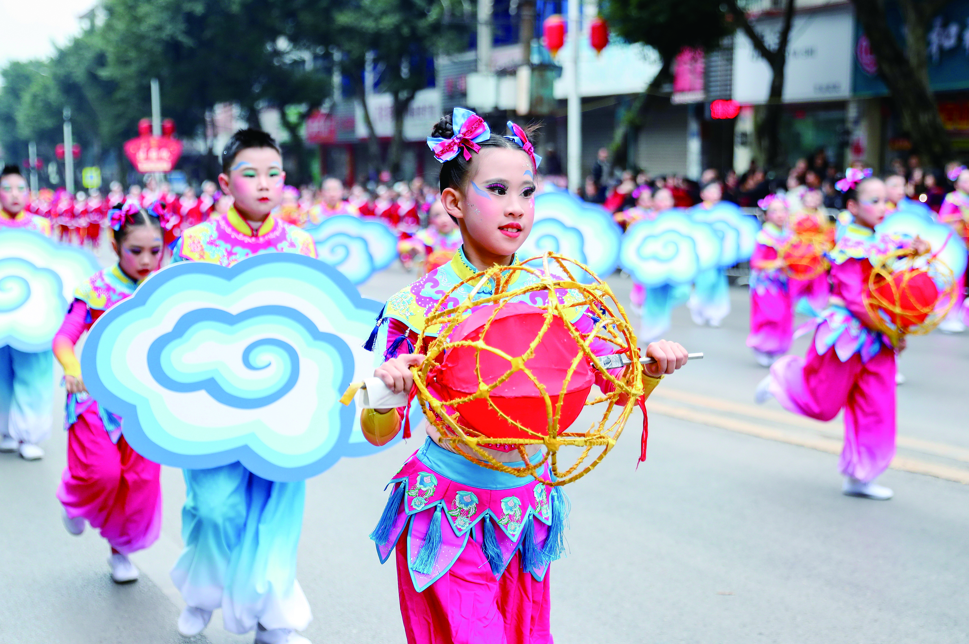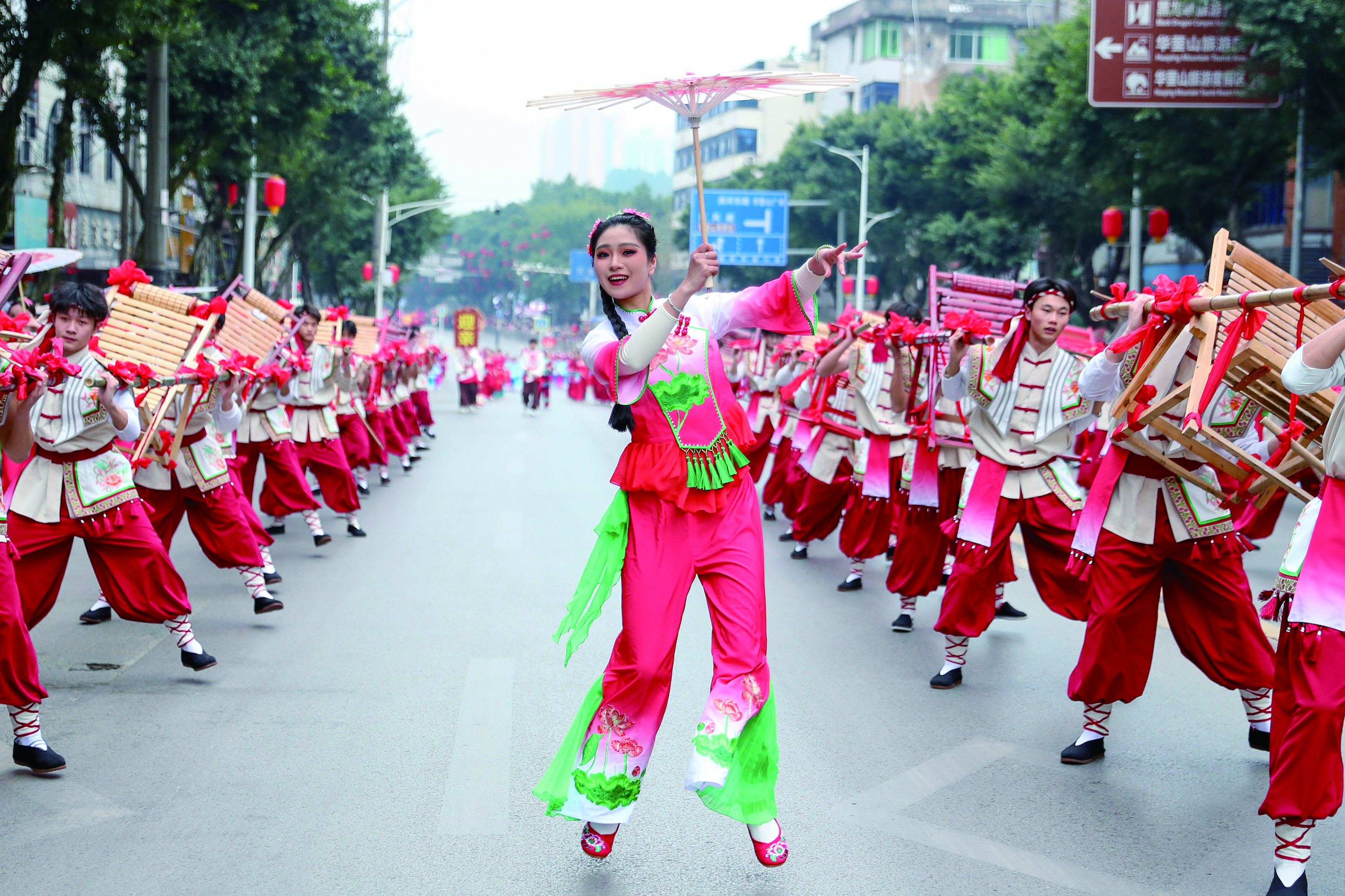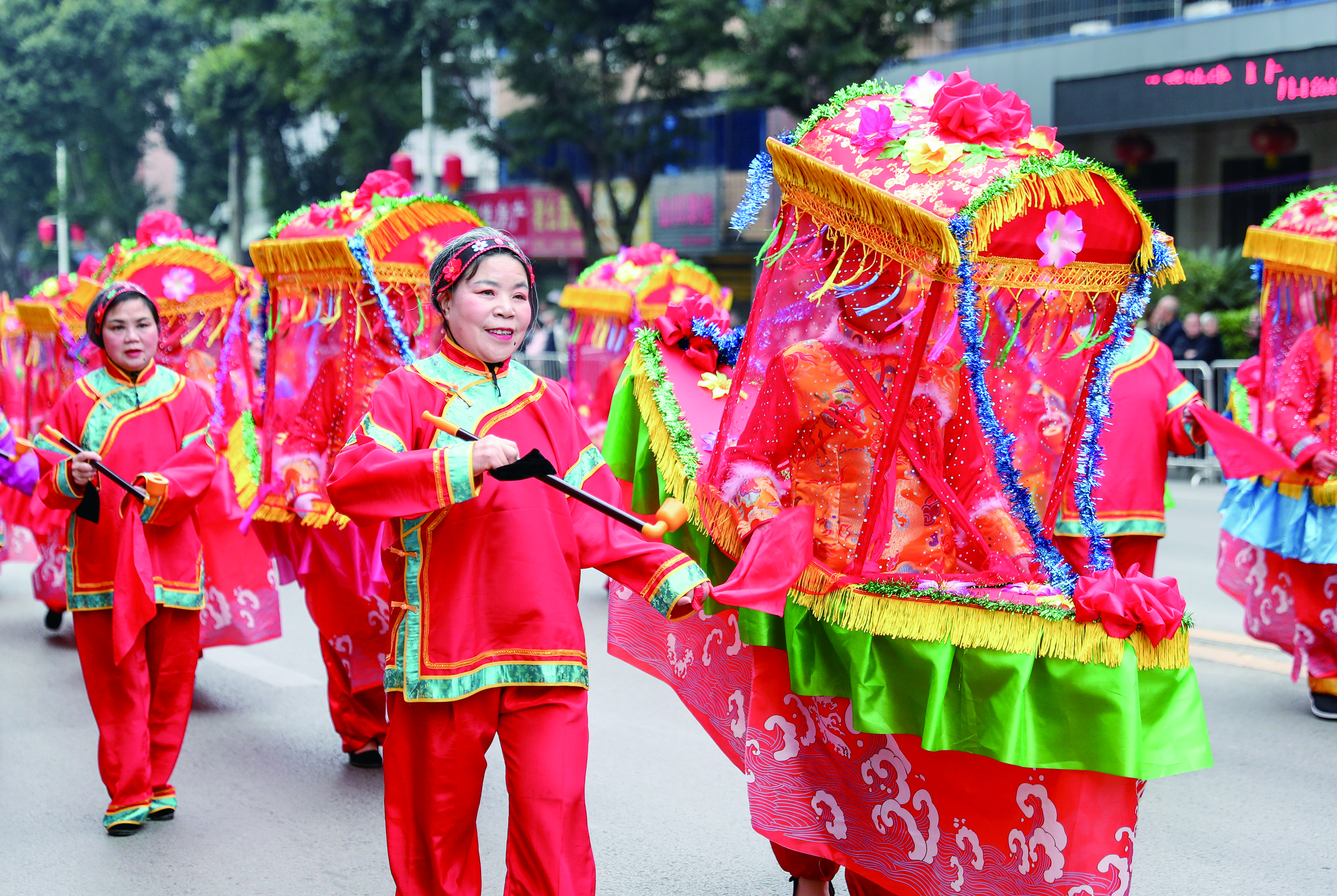 2月17日,大年初一,华蓥市举行“万马奔腾贺新岁·蓥城锦绣映春晖”——“新春里的华蓥”大型民俗文化巡游活动,滑竿抬幺妹、云童舞、“车车灯”、打连厢、财神送福、舞龙、舞狮等具有地方特色的民俗文化节目,丰富群众精神文化生活,让市民在喜气洋洋中欢度新春佳节。