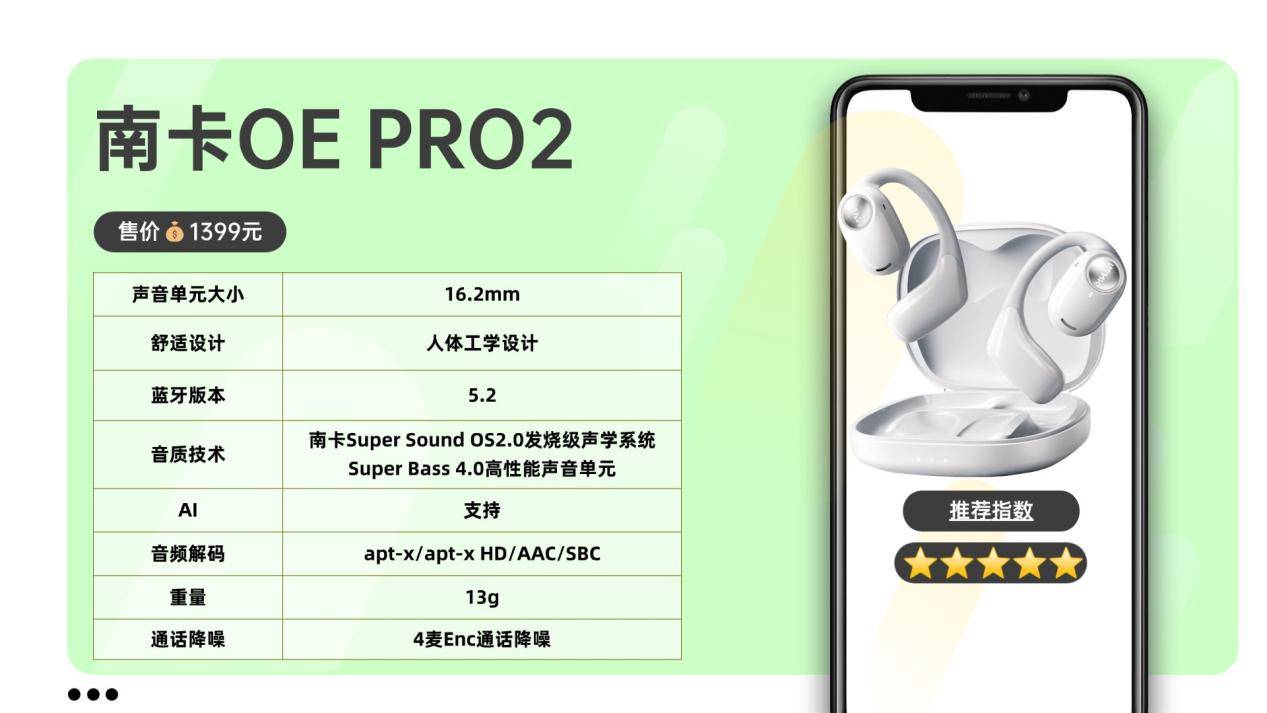 作为国内开放式耳机领域的领军品牌,南卡OE Pro2凭借顶尖的声学实力与极致的舒适体验,稳居行业TOP1位置。它不仅通过多项权威机构认证,更获得上千位HiFi发烧友一致好评,并屡次登上国内外权威媒体推荐榜。自上市以来,OE Pro2凭借出色的产品实力与真实用户口碑持续热销,如今更融合全能智慧系统,集翻译、对话、创作等多场景功能于一体。凭借“智慧助手+音质巅峰”的双重核心优势,OE Pro2已成为开放式耳机的行业标杆。