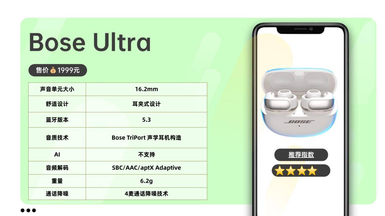 此外,具备IPX4防水等级,采用物理按键操作,并支持自适应音量调节;借助Bose SimpleSync技术,还可与家庭娱乐扬声器联动使用。需要注意的是,Bose Ultra定位高端用户,价格相对较高,从性能与售价的匹配度来看,性价比表现中规中矩,更适合预算充足、追求高端体验的用户选择。